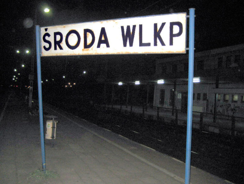 PKP Środa Wielkopolska. Tablica przystanku na peronie 2. Około północy przejeżdża tu para pociągów sezonowych relacji Katowice - Kołobrzeg.