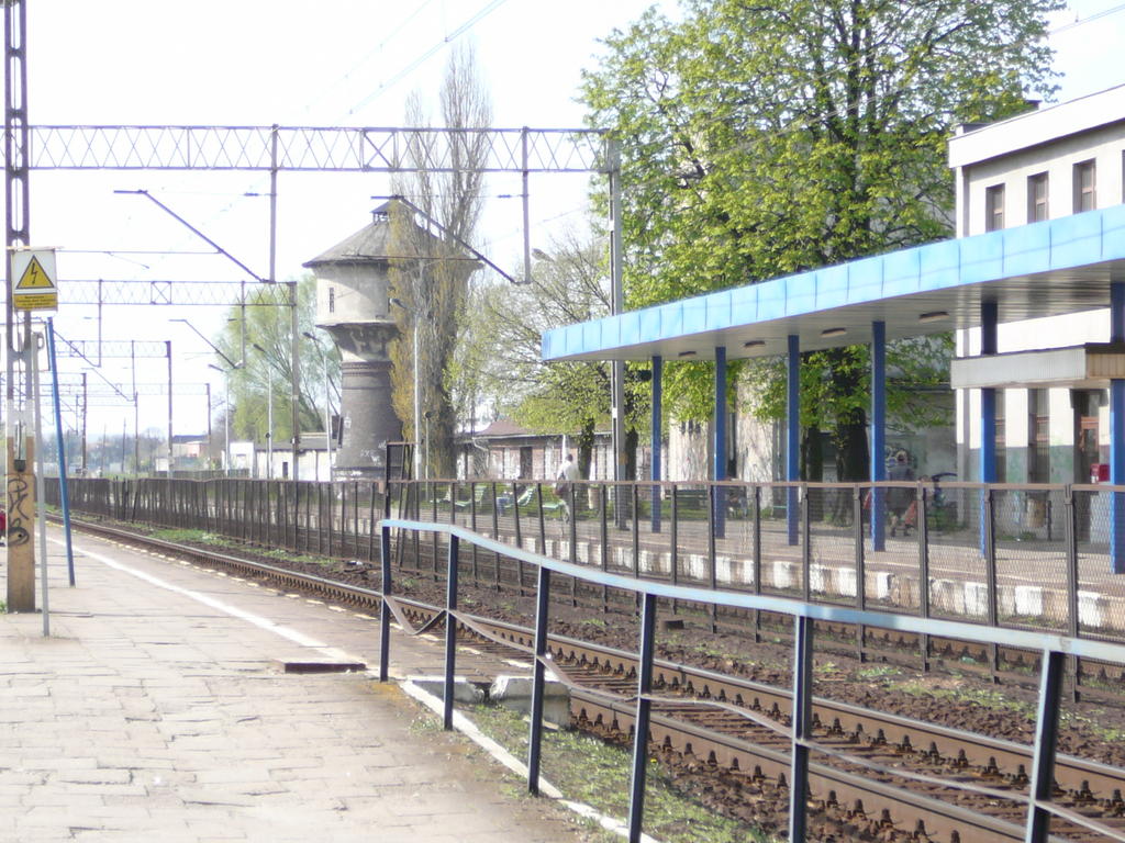 Stacja Środa Wielkopolska - budynek stacyjny, wieża wodna, widok w kierunku stacji Poznań Główny.