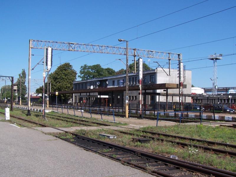 Widok na budynek stacyjny i wiatę nad peronem pierwszym, z którego odjeżdżają pociągi w kierunku Poznania.