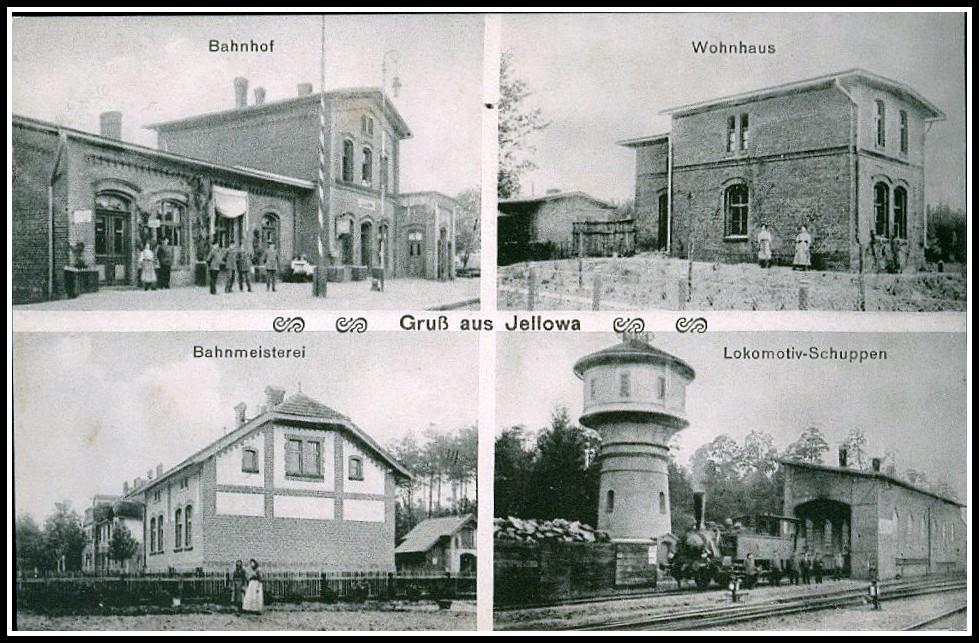 Stara pocztówka. Lewe, górne pole - budynek dworca. Lewe, dolne pole - budynek mieszkalny (majstra kolejowego). Prawe, dolne pole - lokomotywownia i wieża wodna.