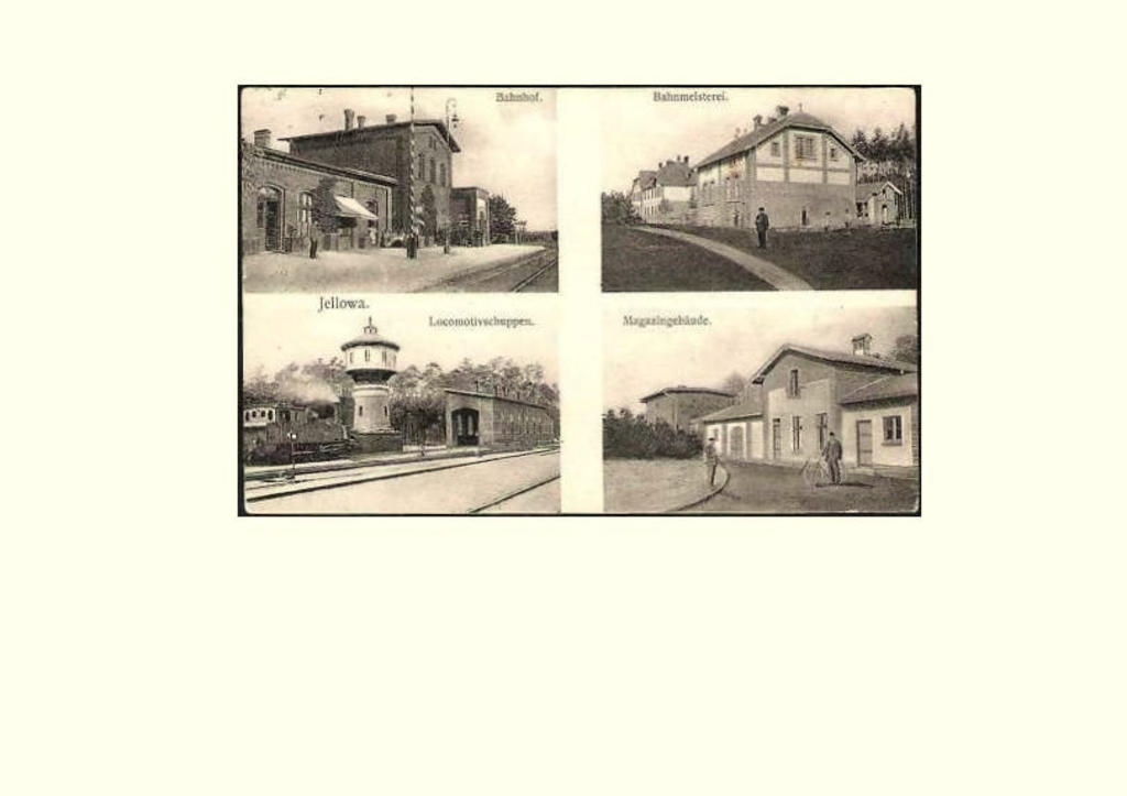 Stara pocztówka. Lewe, górne pole - budynek dworca. Prawe, górne pole - budynek mieszkalny. Lewe, dolne pole - lokomotywownia i wieża wodna. Prawe, dolne pole - magazyn towarowy.