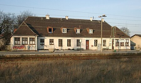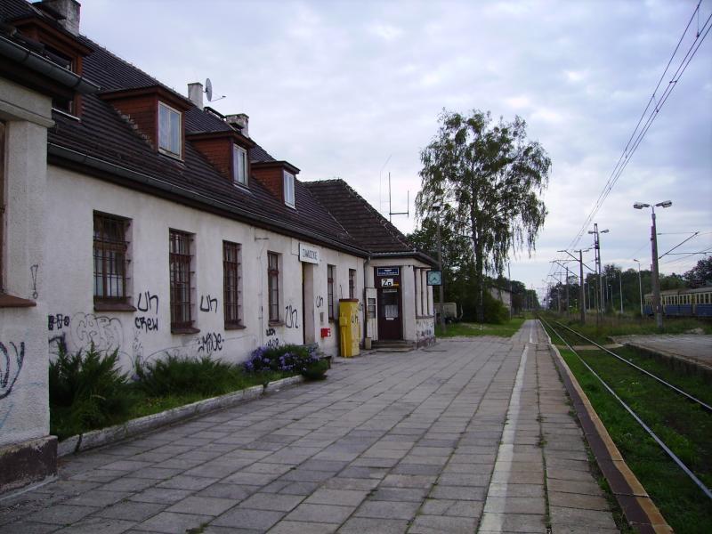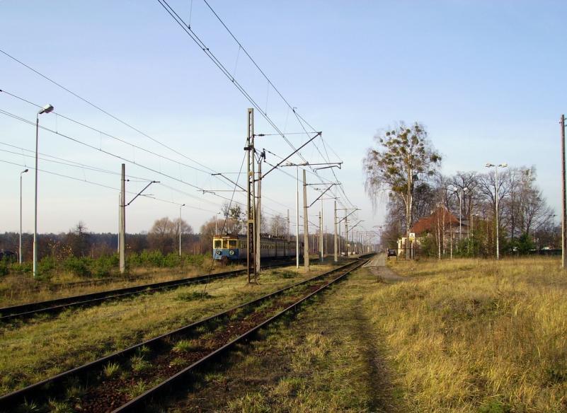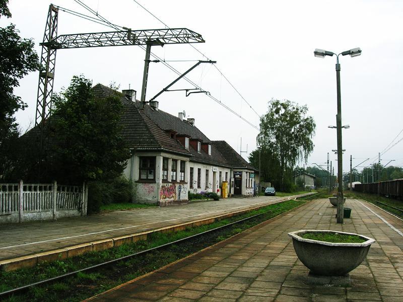 Budynek dworca od strony torów jeszcze nie jest odmalowany. Widoczne tory w kierunku Tarnowskie Góry.
