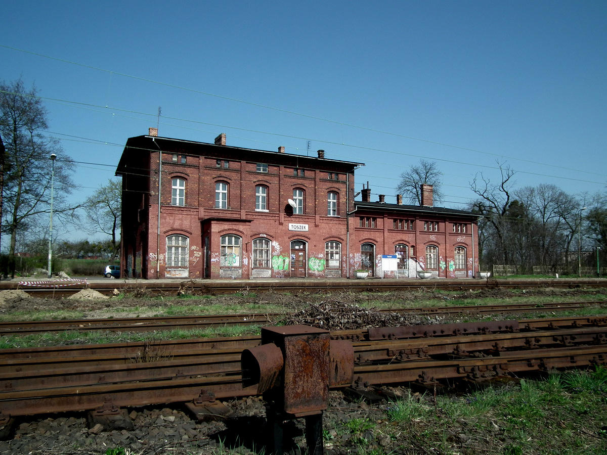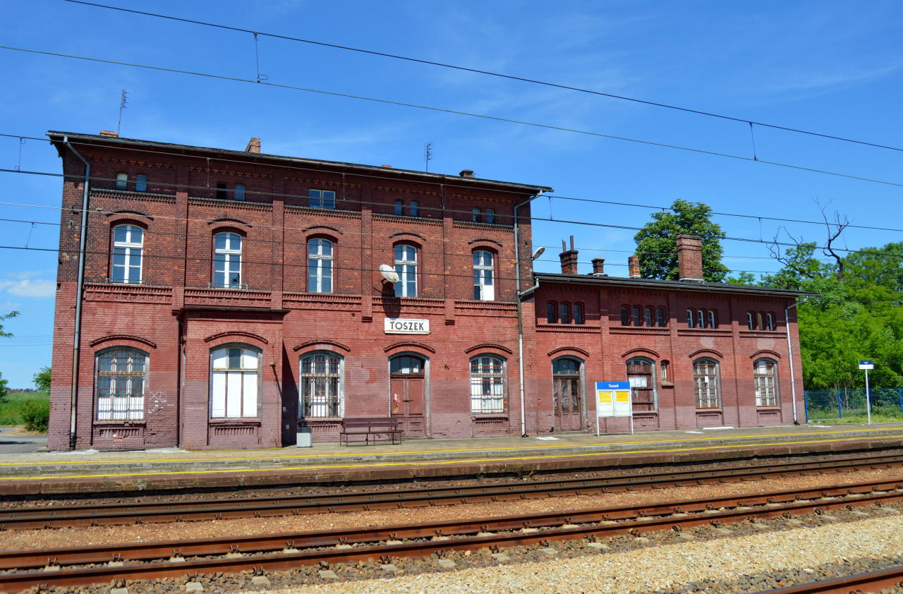 Stacja PKP Toszek. Budynek dworcowy. Przed nim dwa perony i kilka dodatkowych torów. Niektóre z nich są już bardzo wysoko zarośnięte. W lewo Strzelce Opolskie, w prawo Paczyna/Gliwice.