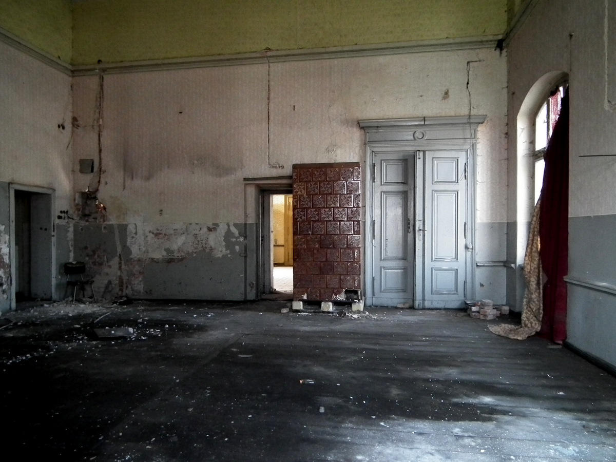 Widok przez wybite okno na jedno z pomieszczeń zamkniętego dworca (prawdopodobnie restauracja).