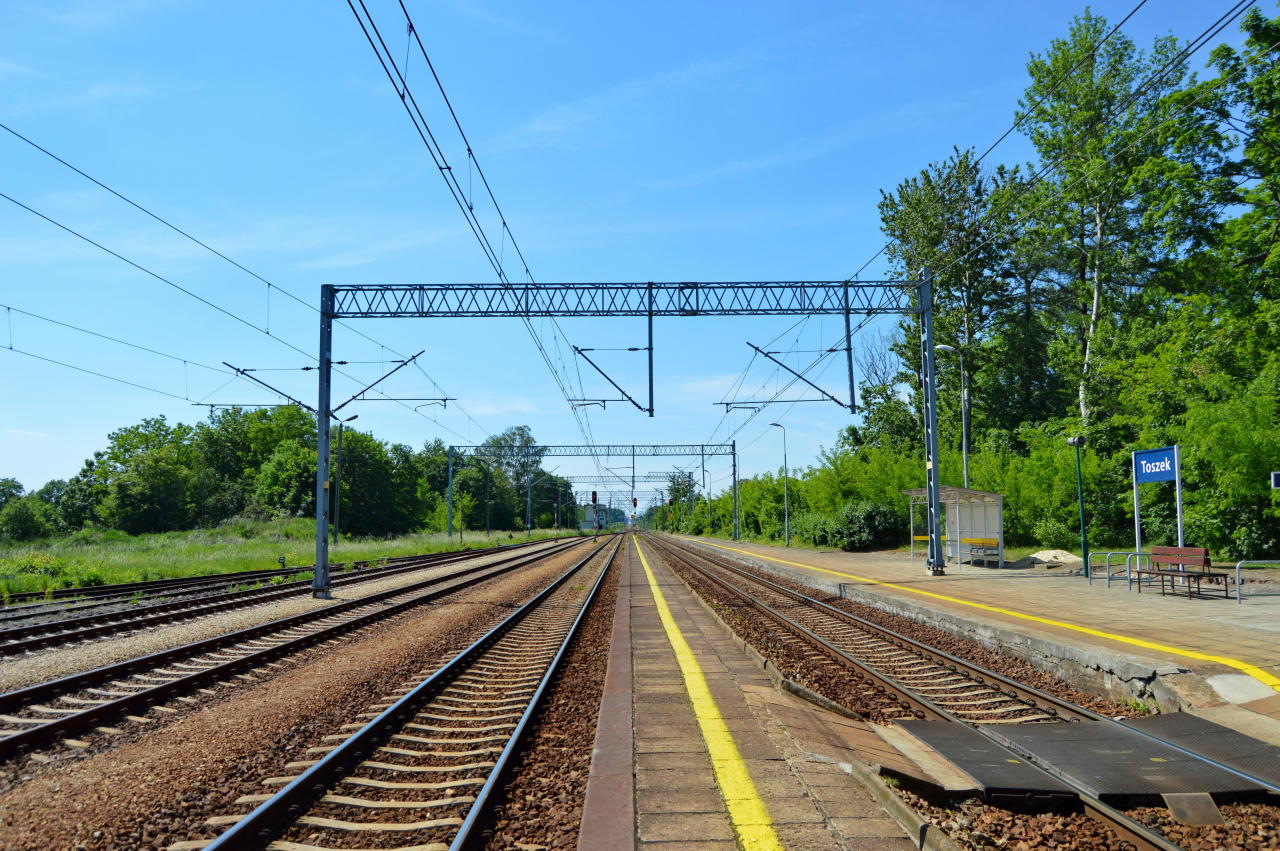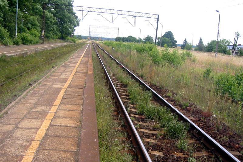 Stacja PKP Toszek. Peron 2 na pierwszym planie. Widok w kierunku Paczyny/Gliwic.