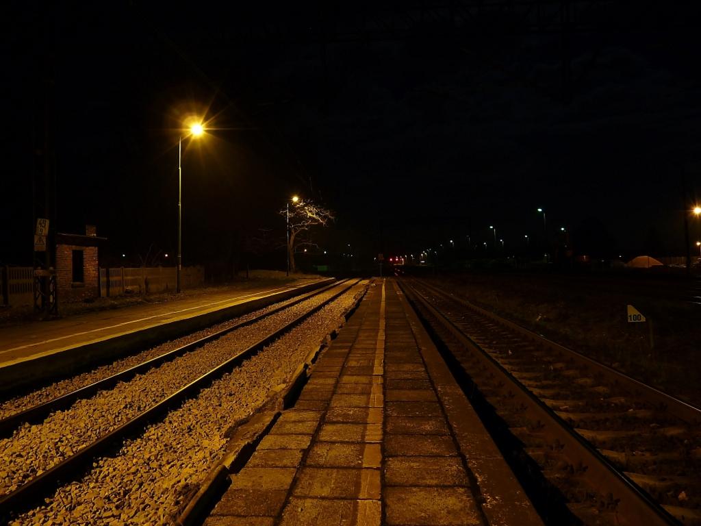Stacja Toszek nocą. Widok na perony w stronę Strzelec Opolskich/Opola.