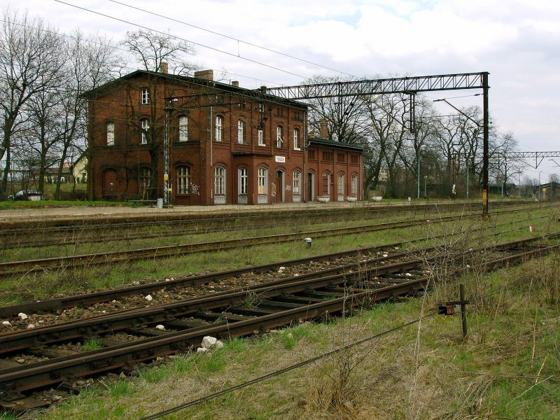 Odremontowana nastawnia wykonawcza, stojąca przy przejeździe kolejowym przez ul. Dworcową i wylocie na Strzelce Opolskie (w prawo). W lewo perony.