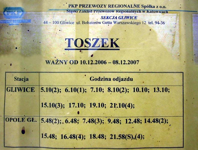 Stacja PKP Toszek. Przez kraty na zamkniętym budynku dworcowym jest dostępny rozkład jazdy pociągów.