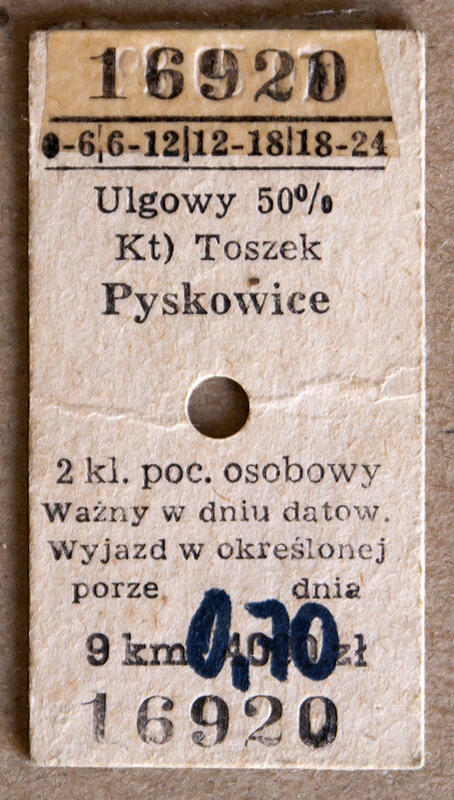 Bilet kartonikowy wydany na stacji Toszek.