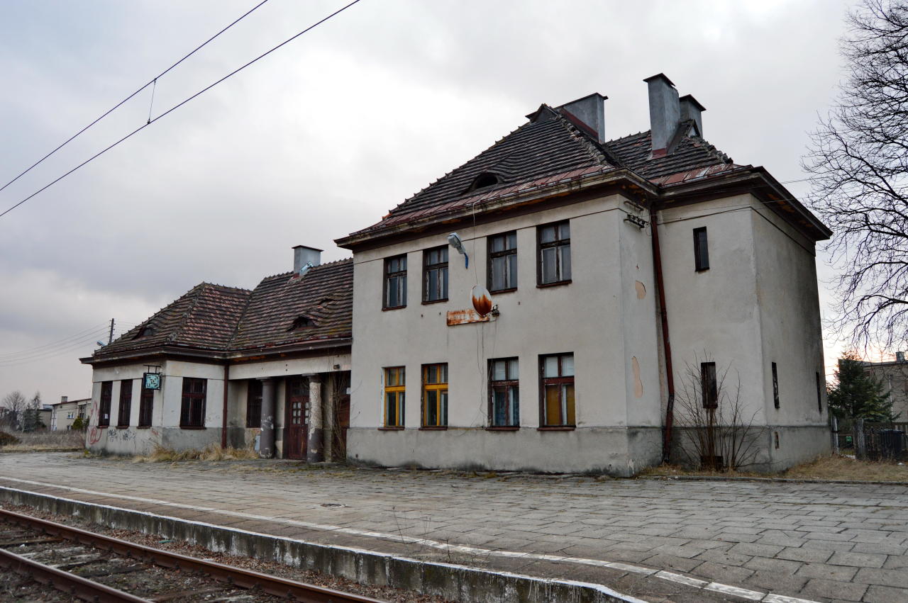 Jeden z nieczynnych budynków stacyjnych stojący wele budynku dworca (z prawej, poza kadrem). Widok w kierunku północno-wschodnim, od strony peronów.