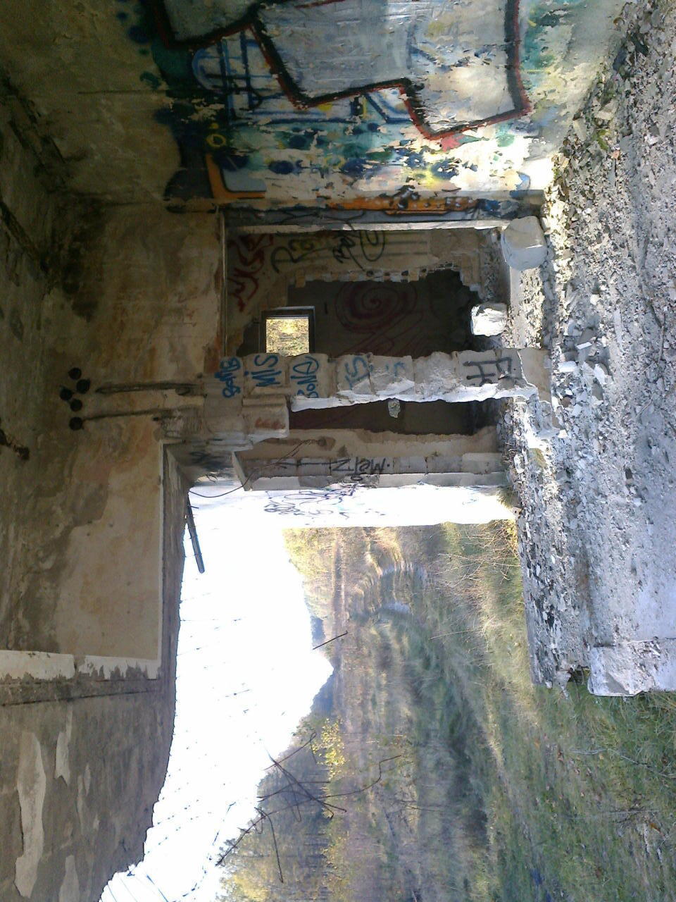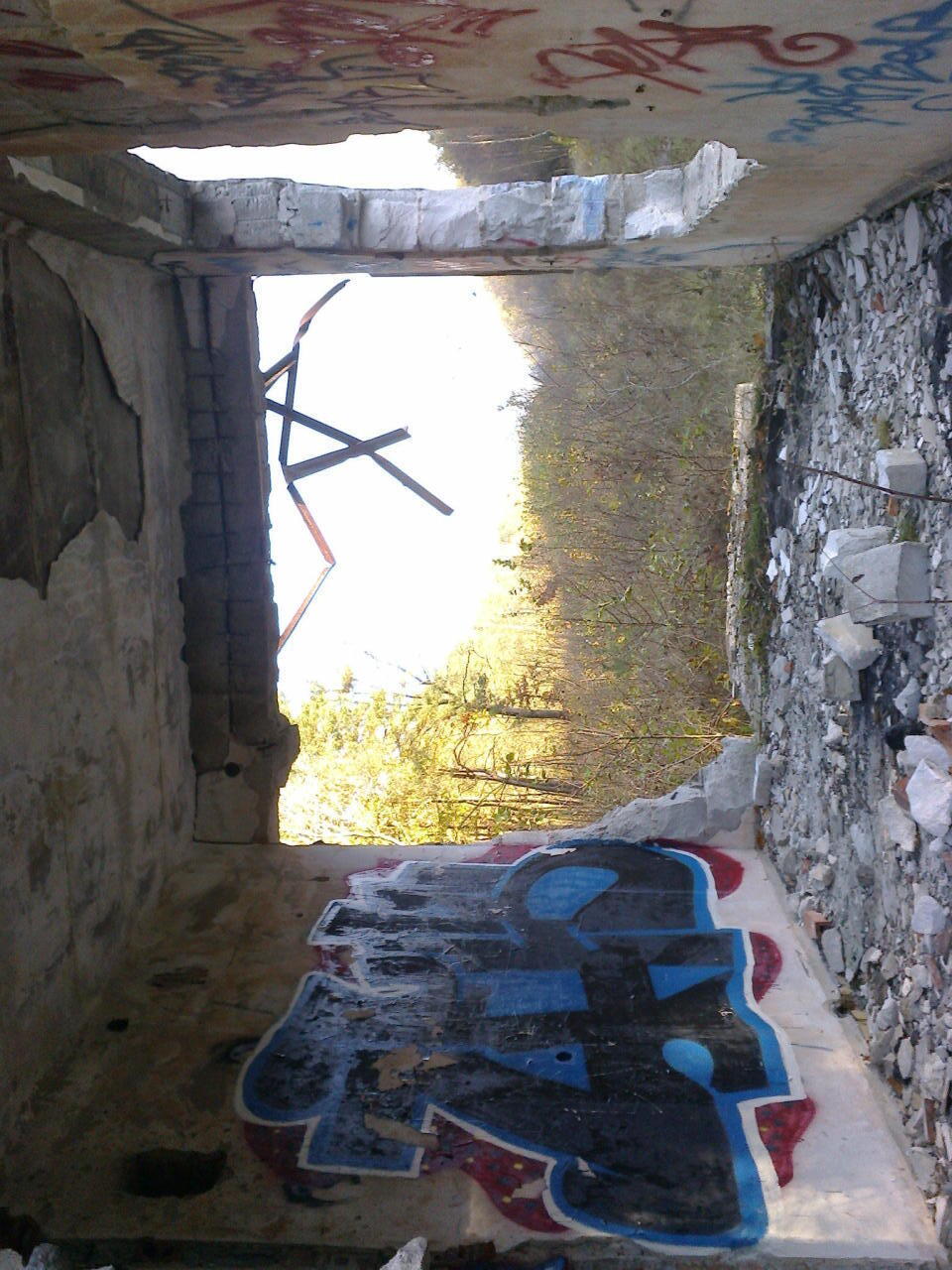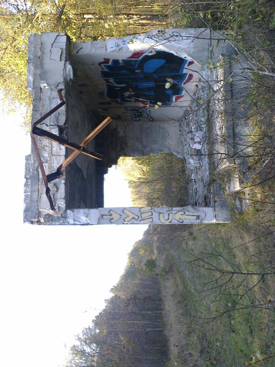 Ruiny dawnej nastawni dysponującej. Czas i domorośli artyści zrobili swoje.