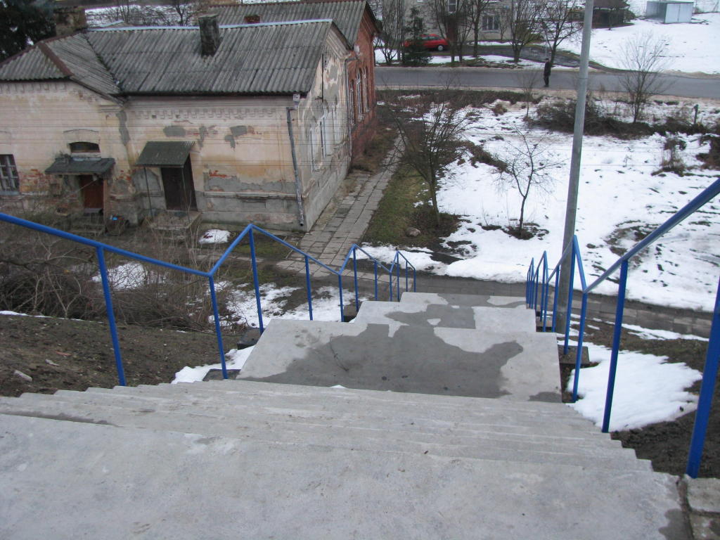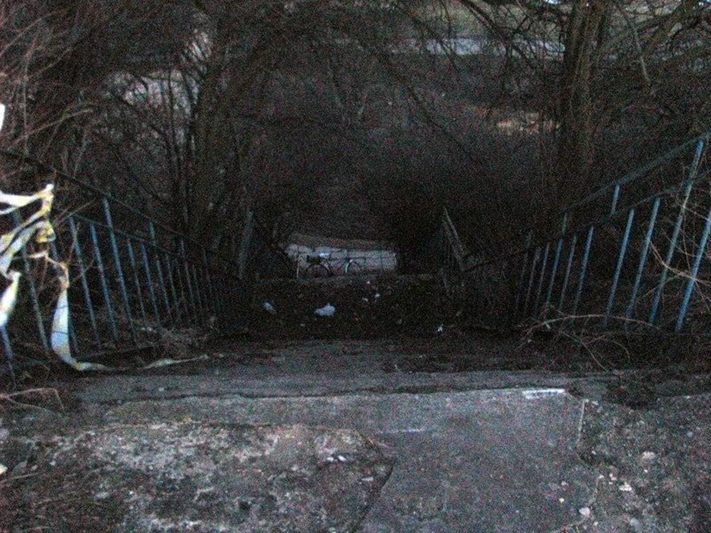 Schody na peron. Na peron prowadzą dosyć szerokie schody. Obecnie bardzo zaniedbane. Zdjęcie robione wieczorem, więc słaba jakość oświetlenia.