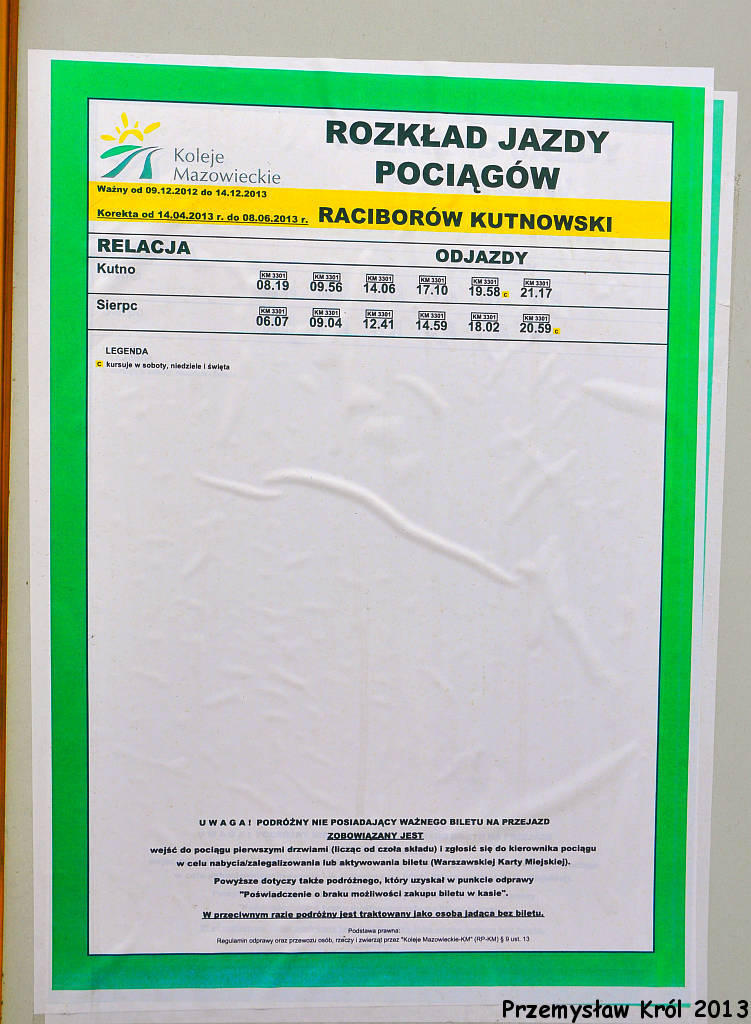 Opis ogólny: Po zmianie w rozkładzie od 10.12.2006 na stacji nie zatrzymują się pociągi pasażerskie (konkretnie jeden pociąg) "do odwołania" więc może już nigdy się nie będą zatrzymywać... (info: Krzysztof Marciniak, 2007-01-23) Wg. rozkładu obowiązującego do 13.12.08 z tej stacji pociągami dojechać można do KUTNA i SIERPCA.Stacja posiada tablicę z napisem RACIBORÓW KUTNOWSKI. (info: ADAM PIOTROWSKI , 2007-12-22) Do miejscowości Sójki, na wschód, biegła kilkukilometrowa bocznica do miejscowej żwirowni. (info: Krzysztof Marciniak, 26-03-2008) |