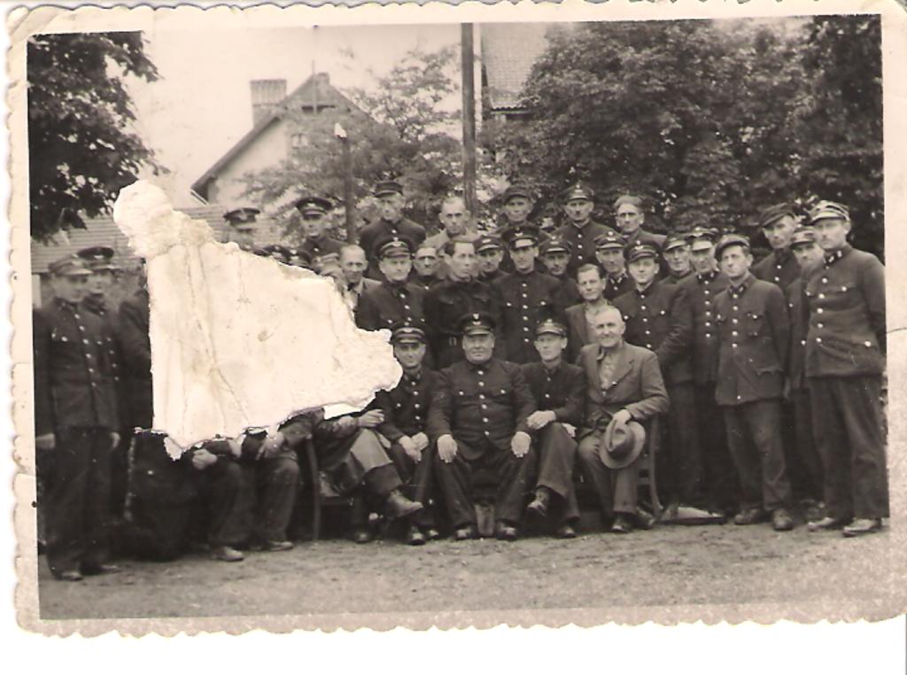 Fotografia (niestety, uszkodzona) kolejarzy stacji Pruszcz - Bagienica. Zdjęcie wykonano w latach 1945 - 1949. Dziewiąty od lewej w drugim rzędzie - Kazimierz Perlik.