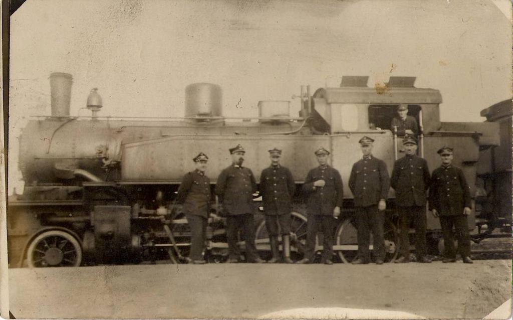 Kolejarze stacji Pruszcz - Bagienica. I-szy od lewej Jan Mazurkiewicz (1892 - 1952), kierownik pociągu. Zdjęcie wykonano prawdopodobnie w latach międzywojennych.