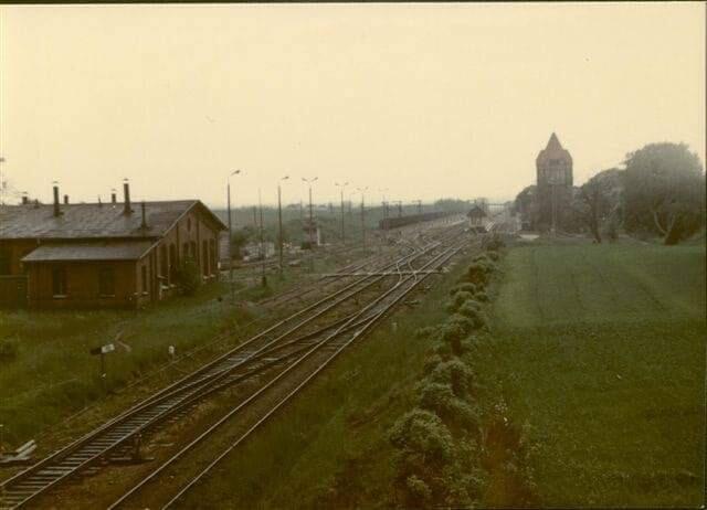 Widok na równię stacyjna z wiaduktu drogowego. Widok w kierunku Koronowa/Więcborka. Lata 1980-1981.