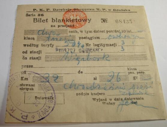 Bilet wydany w Pruszczu-Bagienicy na przejazd Pruszcz Bagienica - Więcbork w dniu 26.05.1946.
