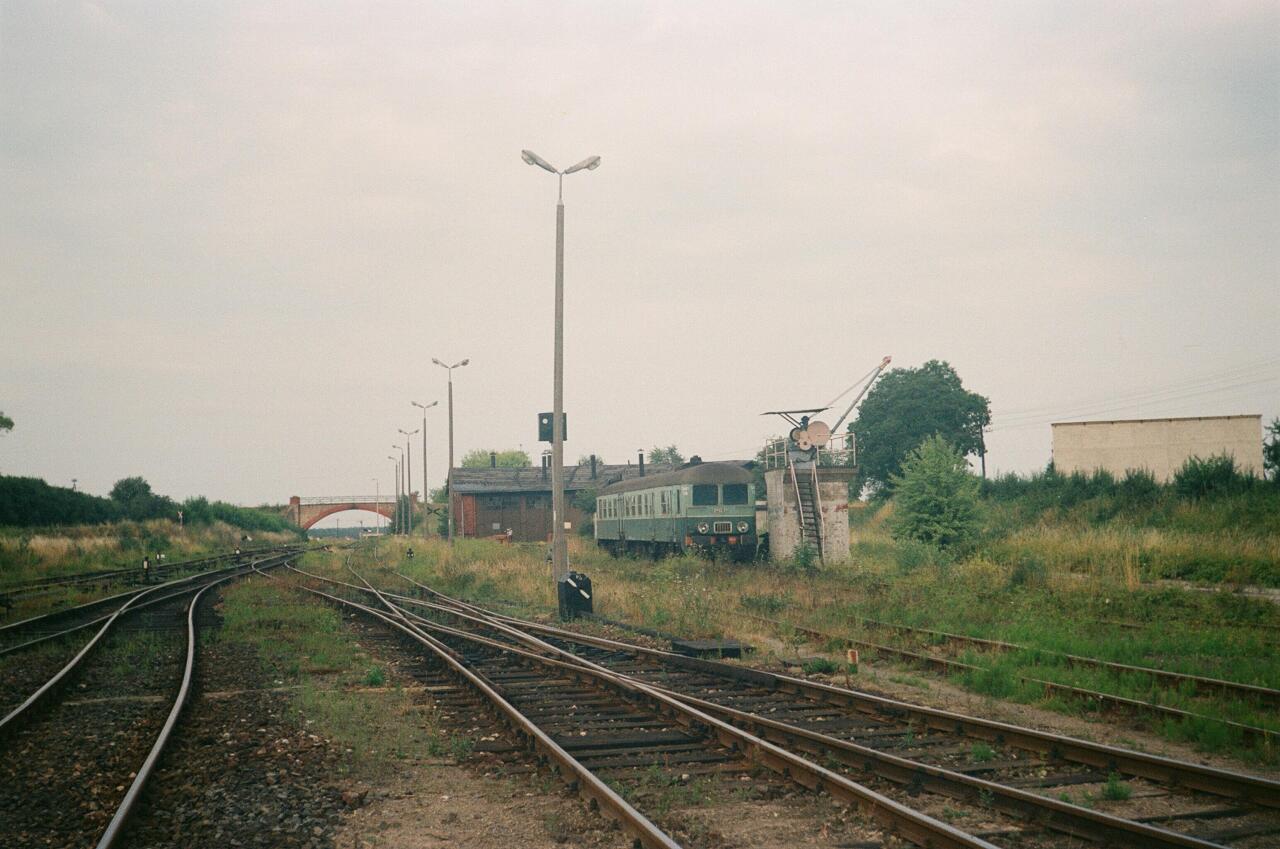 Stacja Pruszcz Bagienica - nieczynny żuraw do nawęglania parowozów, stojący na torze nr 8 wagon spalinowy SN61-138 (MT Chojnice) w oczekiwaniu na zatrudnienie. Widok w kierunku stacji Terespol Pomorski (Świecie nad Wisłą), Tuchola.