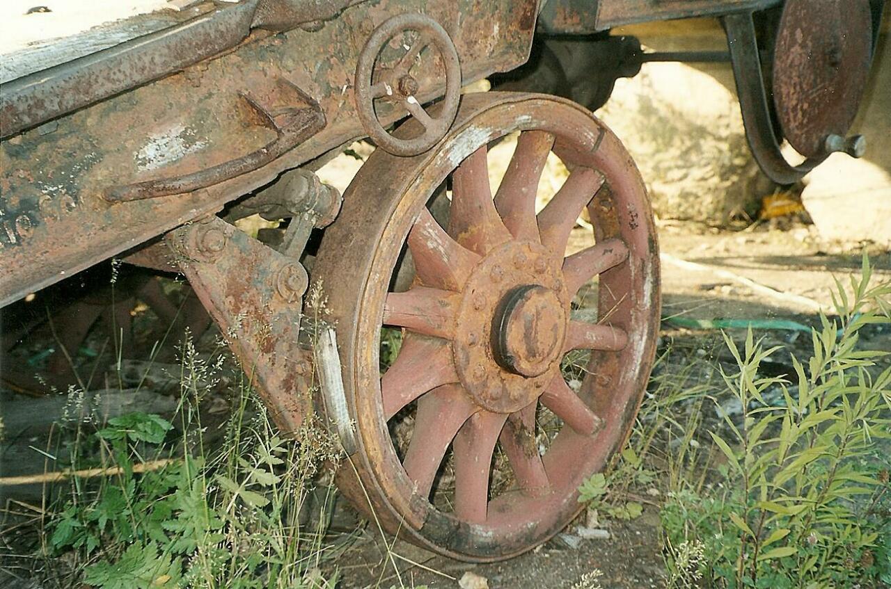 Pomost do rozładunku wagonów z zachowanymi oryginalnymi,drewnianymi kołami oraz częścią układu hamulcowego.