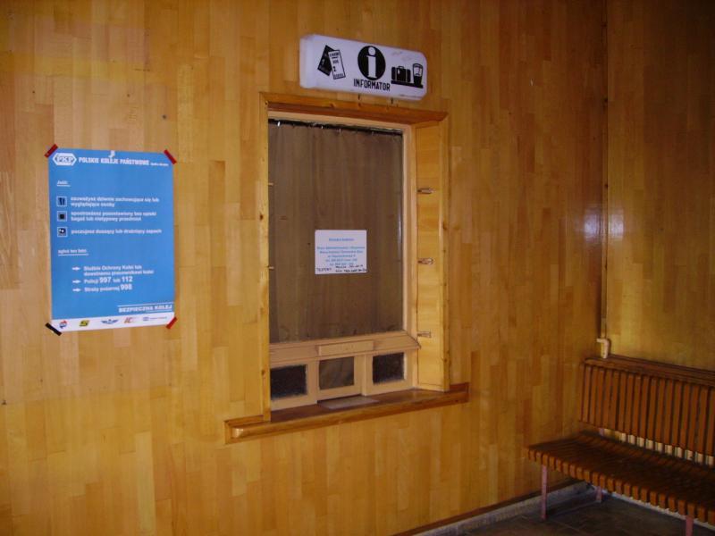 Poczekalnia, okienko kasowe (wygląda na nieczynne).