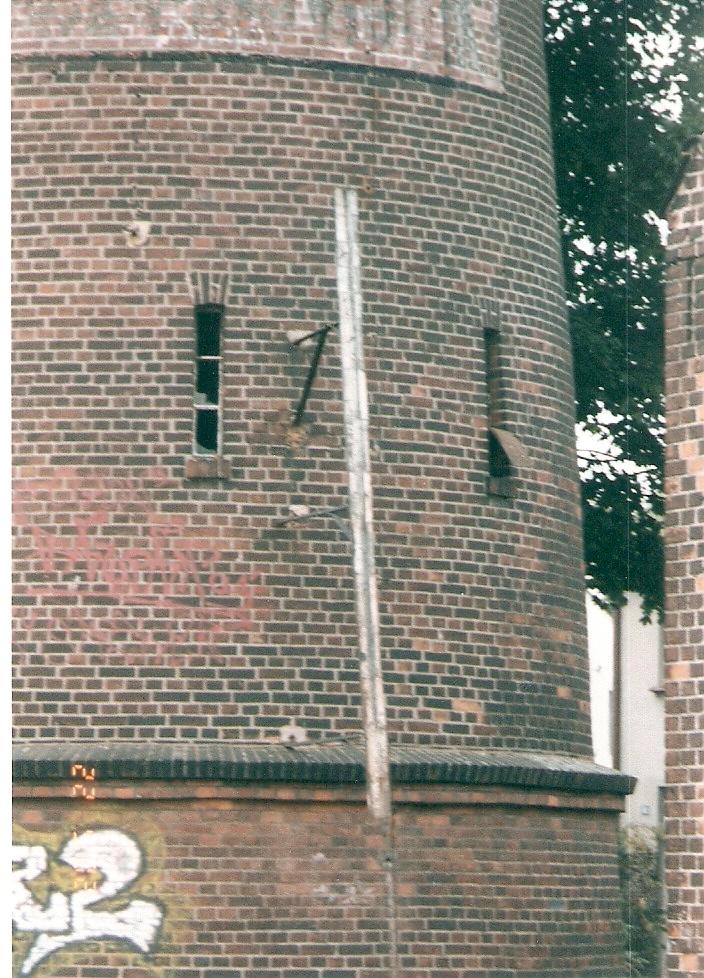 pierwotna wieża wodna znajdowała się ok. 100m na wschód od budynku dworca; została wybudowana na planie prostokąta ok.1851r. przy okazji budowy Królewskiej Kolei Wschodniej; woda była czerpana żurawiem naściennym bezpośrednio ze zbiornika; prawdopodobnie została rozebrana w okresie międzywojennym; obecna wieża wodna (typu Intze) stoi ok. 80 m na wsch od budynku dworca kolejowego Wyrzysk Osiek. Wieża posiada dwa wskaźniki poziomu wody w zbiorniku (zbiornikach? ), na trzonie wieży i na części zbiornikowej. Podobne wieże są m.in. na stacjach Barcin, Choszczno, Gołańcz. (info: Bolesław Wojtyniak, 12-06-2012). |