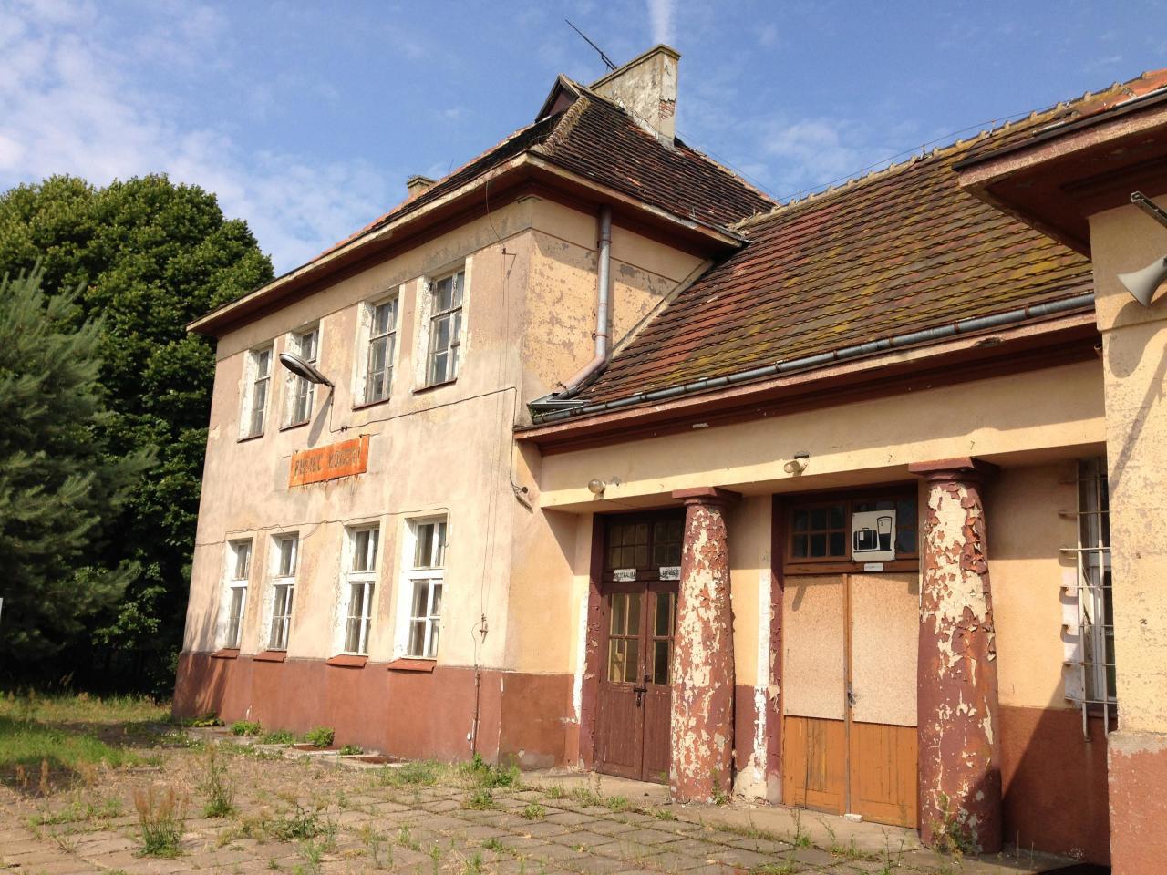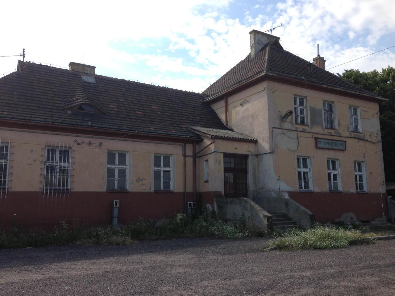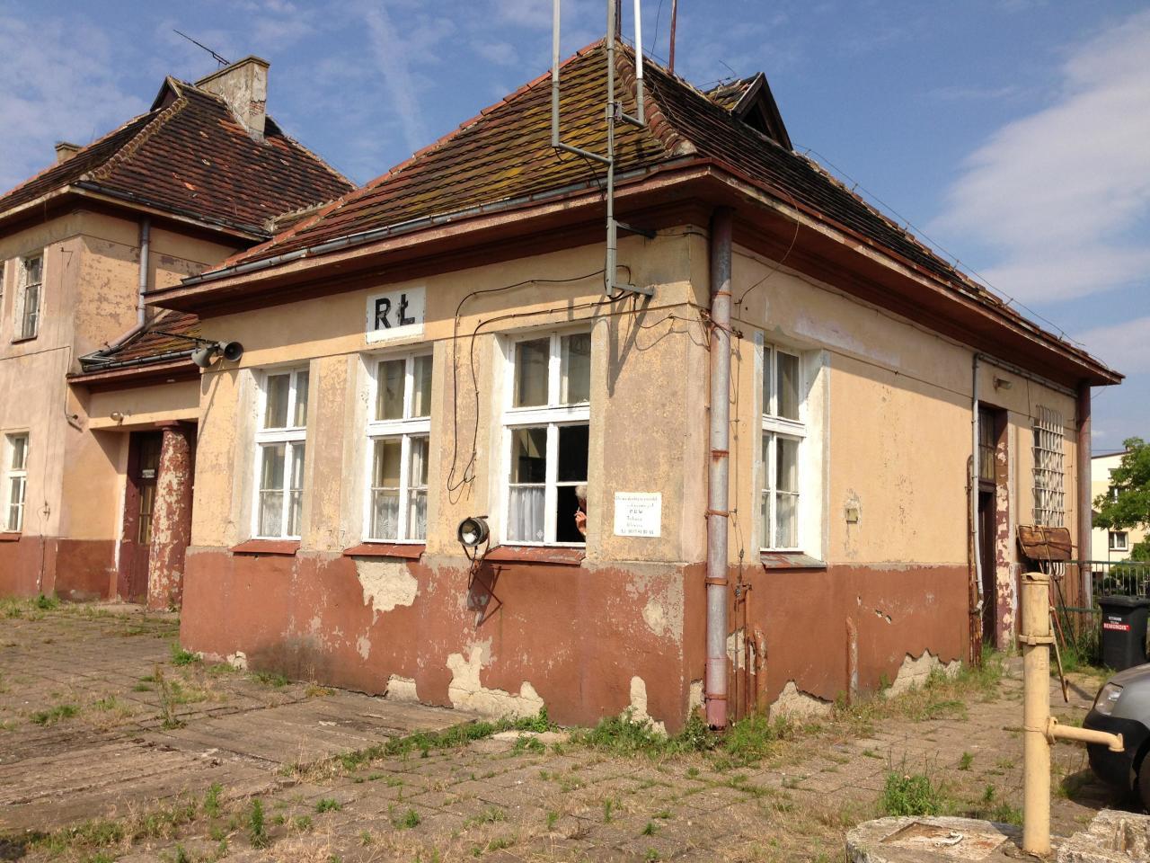 Budynek dworca od strony peronów. Na parterze mieści się nastawnia dysponująca. Widok od strony Chorzewa Siemkowic.