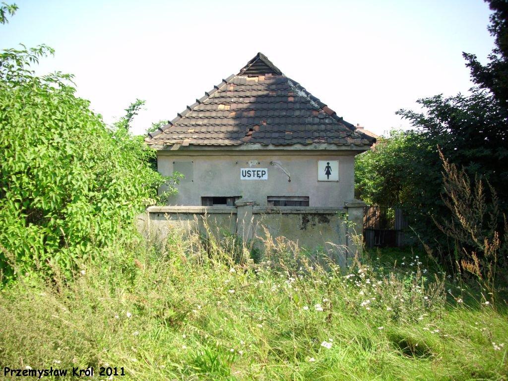 Budynek toalet w Ruścu Łódzkim. Widok z okna pociągu InterRegio "Bursztyn", relacji Gdynia Główna - Katowice.