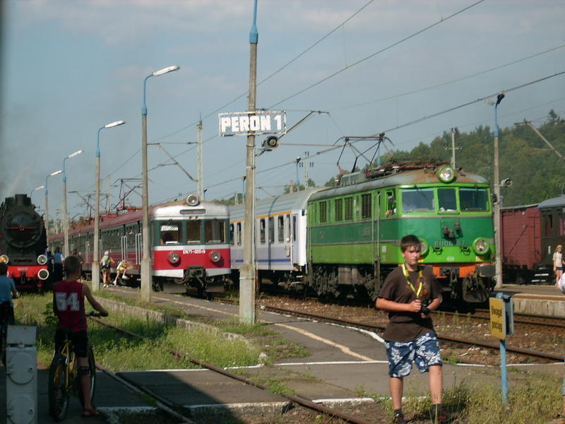 Perony stacji Skawce. Spotkanie przy peronach trakcji parowej i elektrycznej.