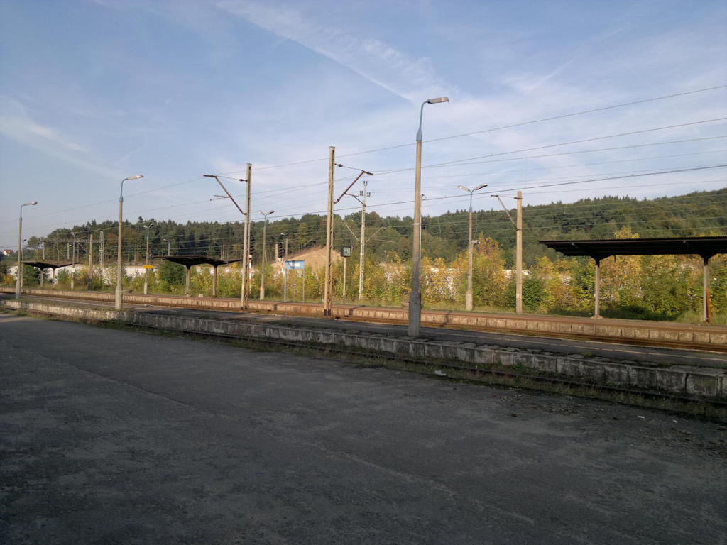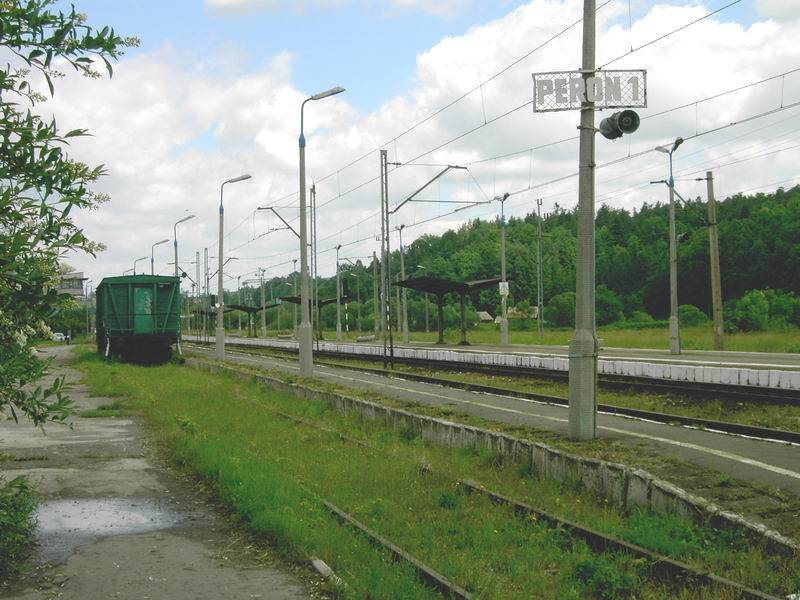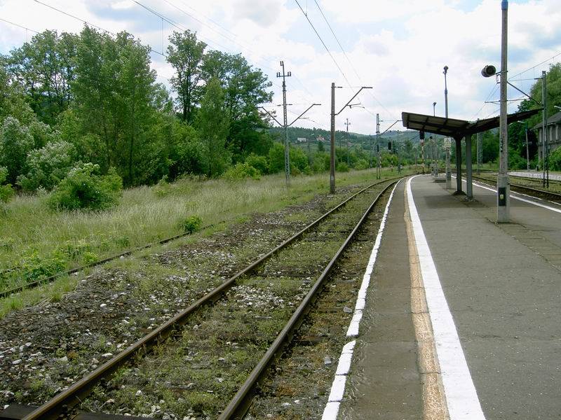 Widok na perony. Jeden z ostatnich widoków na perony stacji. W tym miejscu będzie zbiornik Świnna Poręba.