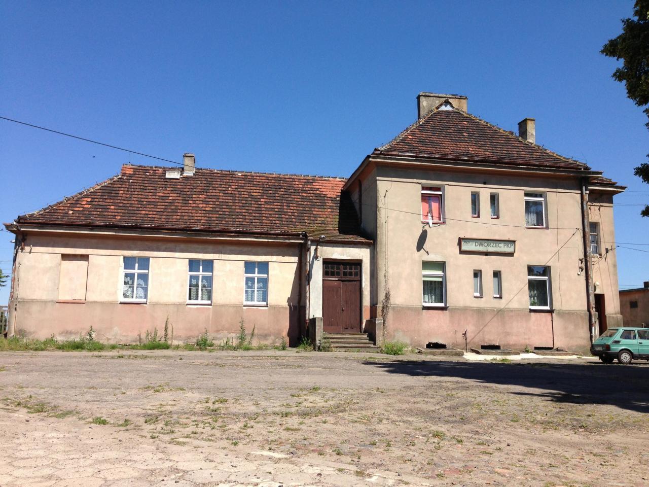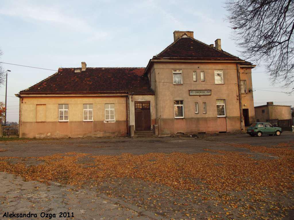 Budynek dworca od strony peronów. Na parterze, po prawej mieści się nastawnia dysponująca. Z lewej część mieszkalna. W lewo Zduńska Wola, w prawo Ponętów/Inowrocław.