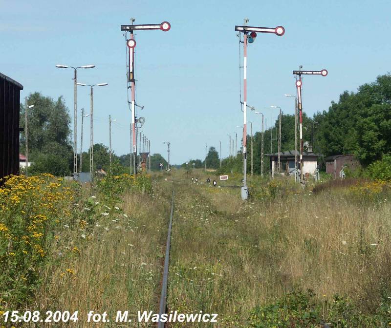 Ostrów Mazowiecka. Grupa semaforów wyjazdowych w kierunku Ostrołęki. W oddali z prawej strony budynek nastawni dyspozycyjnej.
