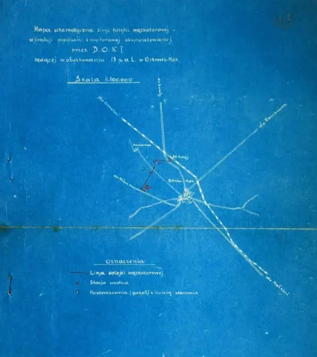 Schemat stacji z zaznaczoną linią wojskowej kolei wąskotorowej - z pracy Tomasza Jankowskiego "Wojskowe koleje wąskotorowe w II RP - przyczynek do badań".