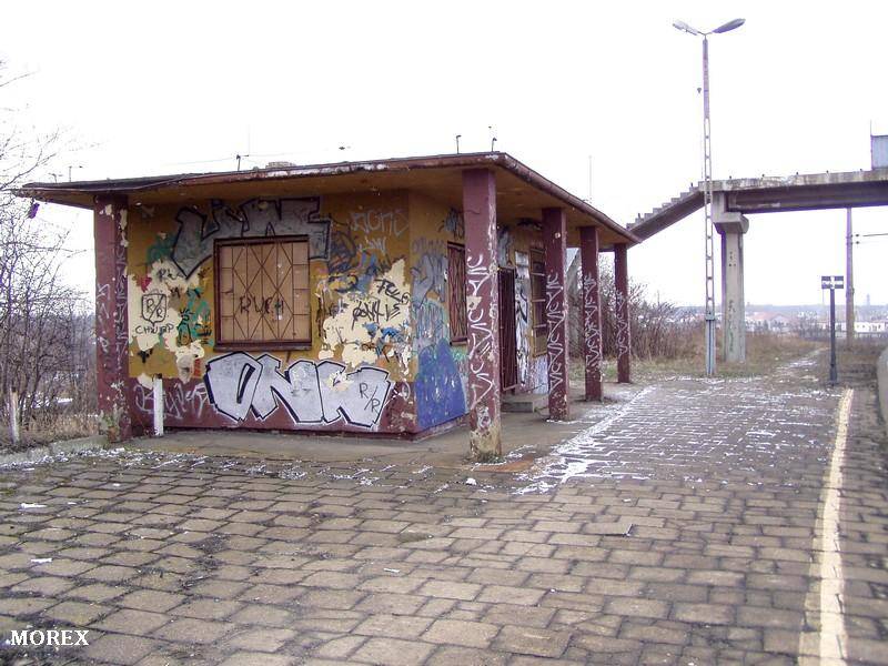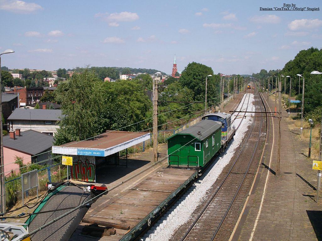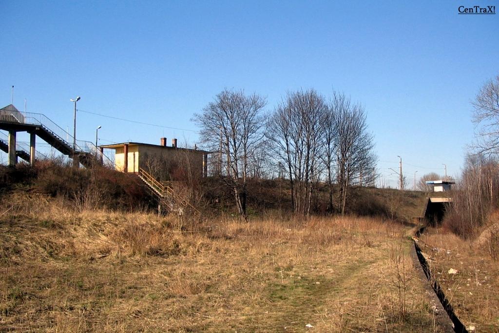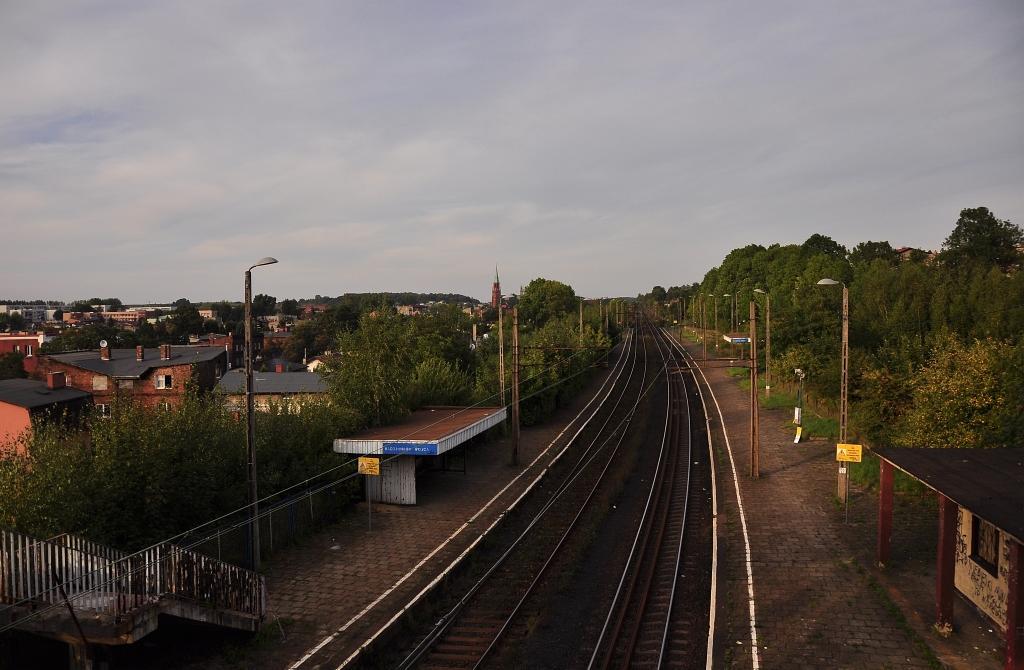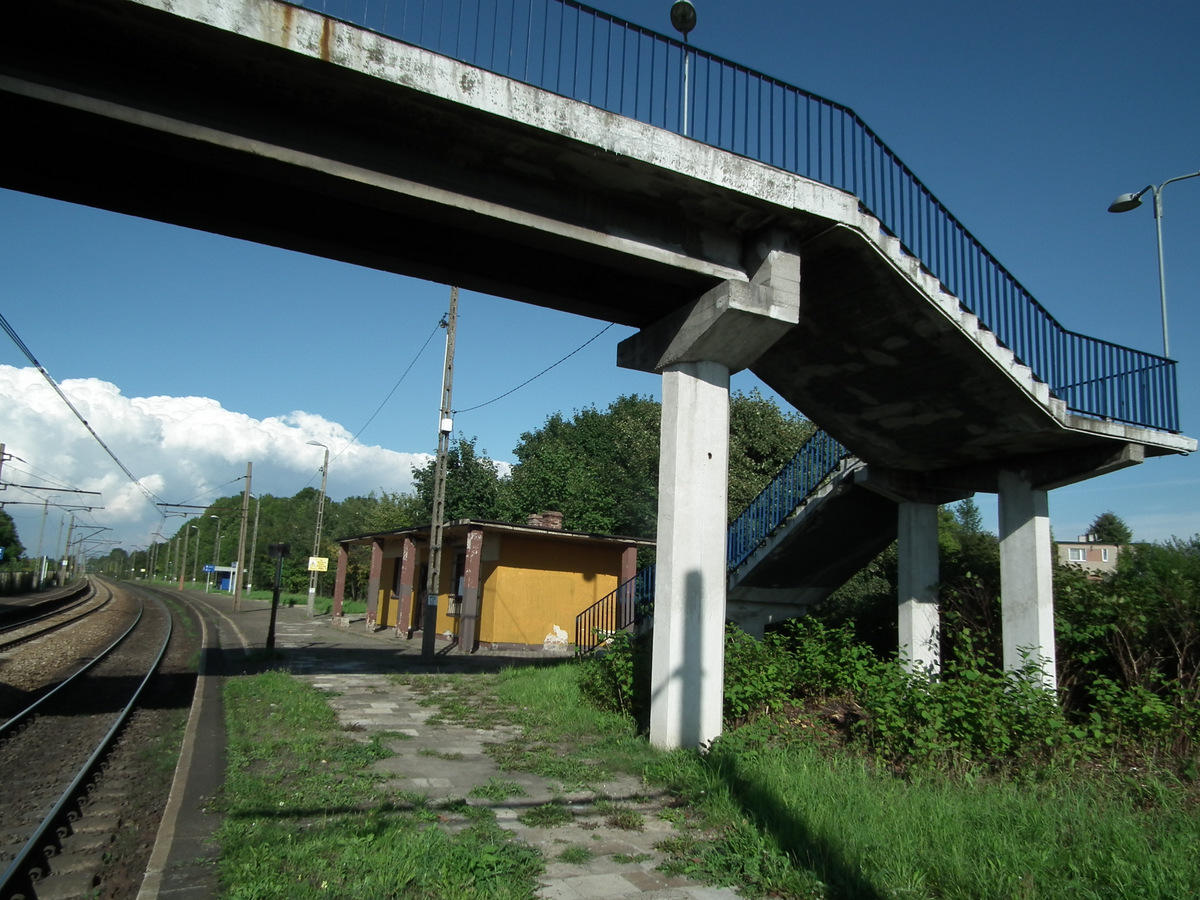 Nieczynny dworzec na peronie 1. Górą kładka nad torami. Widok w kierunku Bytomia Karbia.