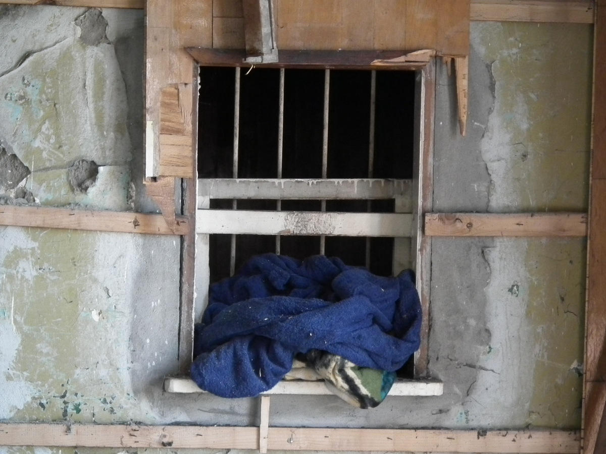 Dawne okienko kasowe w zdewastowanej poczekalni.
