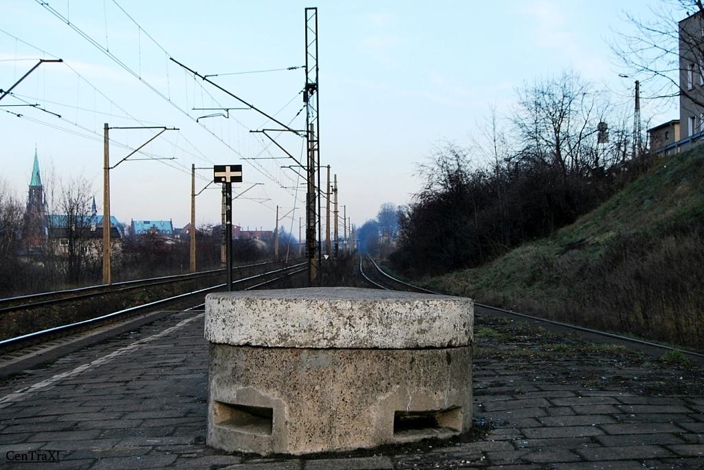 Nieczynna nastawnia stojąca przy peronach obsługujących ruch w stronę Piekar Śląskich Szarleja (w prawo). W lewo stacja Radzionków/Tarnowskie Góry.