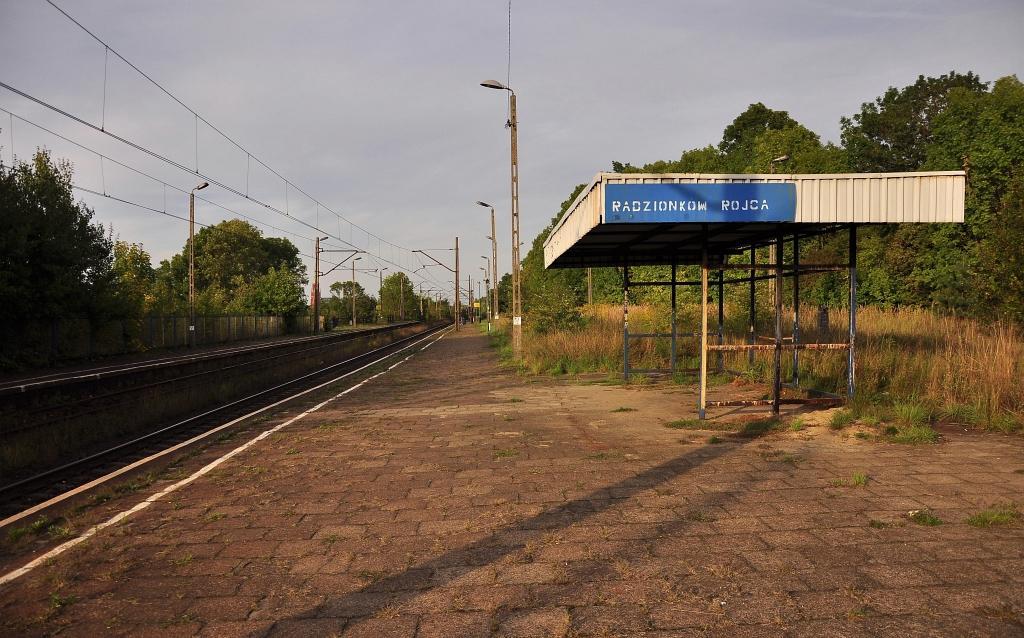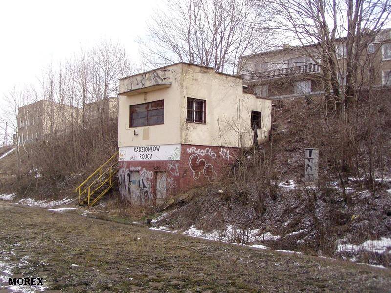 Widok z peronu w kierunku stacji Radzionków. U góry z lewej, budynek kasy a po prawej wiata przystankowa Radzionków Rojca. Pod wiatą tunel którym tor przecinał węglówkę.