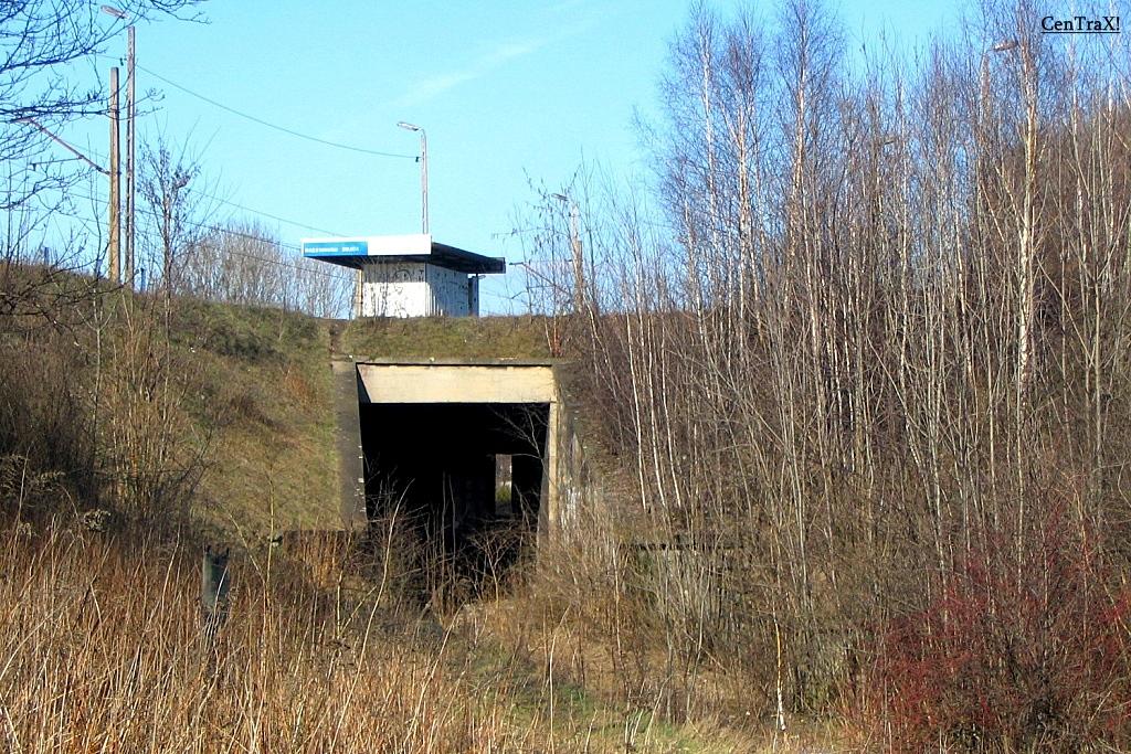 Widok na tunel którym linia z Piekar Śląskich Szarleja krzyżowała się z węglówką. U góry wiata przystankowa. Peron dla pociągów odjeżdżających dawniej w kierunku Piekar Śląskich Szarleja. Widok w kierunku stacji Radzionków/Tarnowskich Gór.