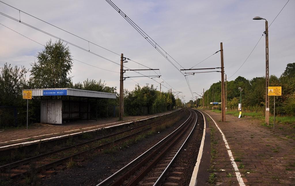 Miejsce po wyburzonym posterunku. Z lewej peron obsługujący dawniej ruch z Piekar Śląskich Szarleja. Widok w kierunku stacji Radzionków/Tarnowskich Gór.