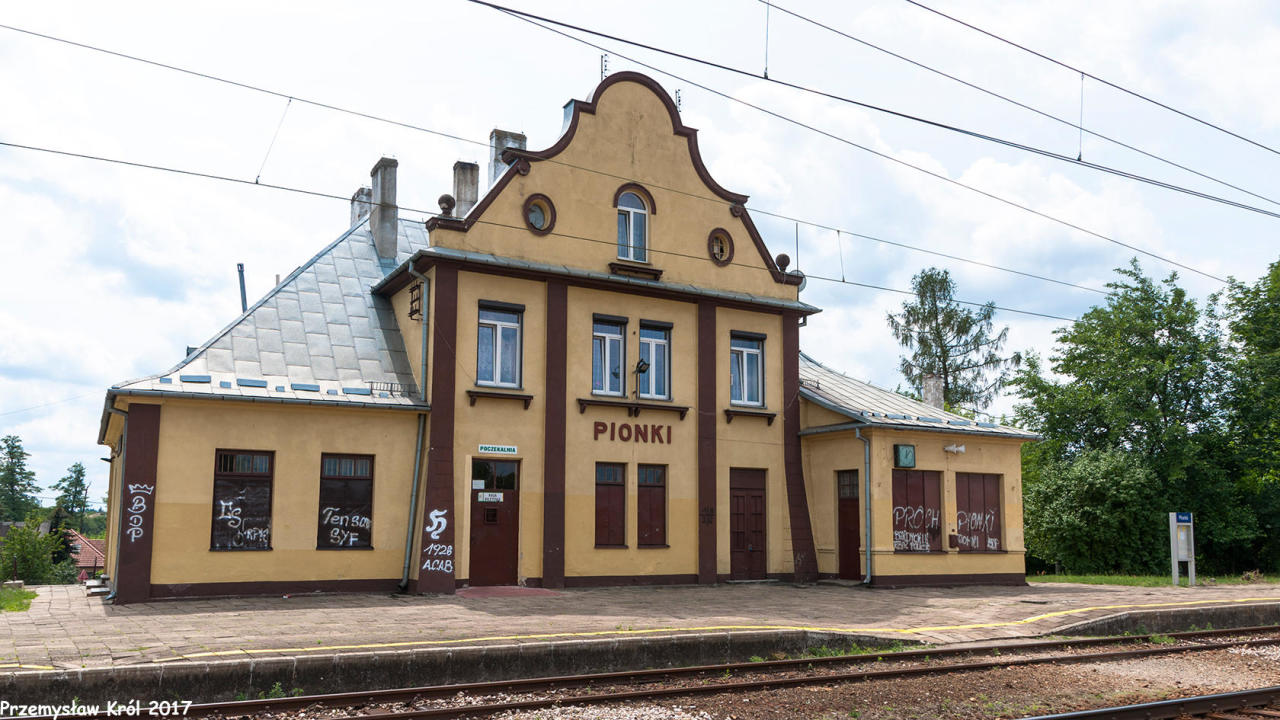 Opis ogólny: Stacja Pionki znajduje się w starszej części miasta i obsługuje pociągi regionalne. Kiedyś była na tej stacji bocznica z zakładów chemicznych PRONIT (info: BASIK) Opis infrastruktury: Na stacji znajduje się rampa załadunkowa, która jest sporadycznie użytkowana do załadunku drewna i rozładunku węgla. (info: Michał Marciniak, 11-01-2024). Opis budynków: Opis budynków: Budynek dworca wyremontowany. Ogrzewana poczekalnia i toaleta dostępna dla podróżnych. (info: Michał Marciniak, 11-01-2024). info: Lokomotywowni nigdy nie było na stacji Pionki. Była tylko wewnątrz Zakładów Chemicznych PRONIT Pionki, do których z tej stacji odchodziła bocznica normalnotorowa obsługiwana przez własny tabor(kilka parowozów i lokomotyw spalinowych i wąskotorowych).Kilkaset metrów od stacji była tzw. parowozownia wąskotorowej kolejki leśnej (obecnie skansen tej kolejki). (info: Bogusław Warchoł). |