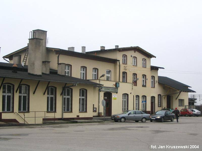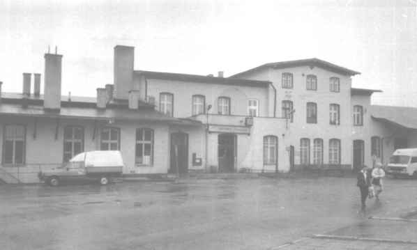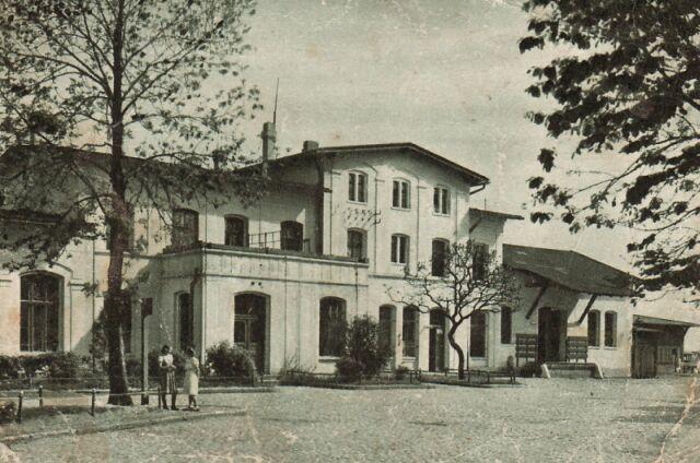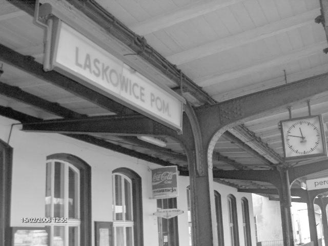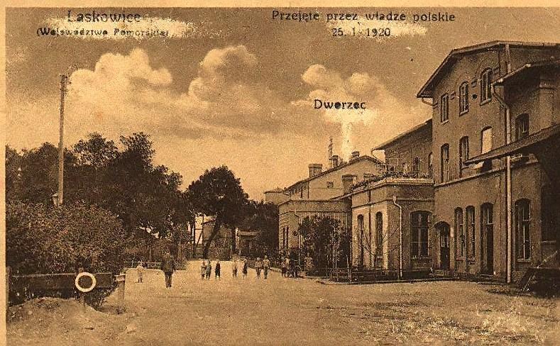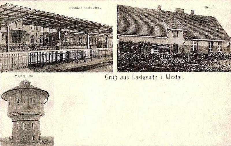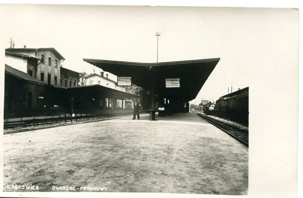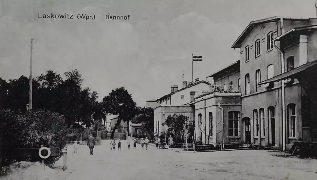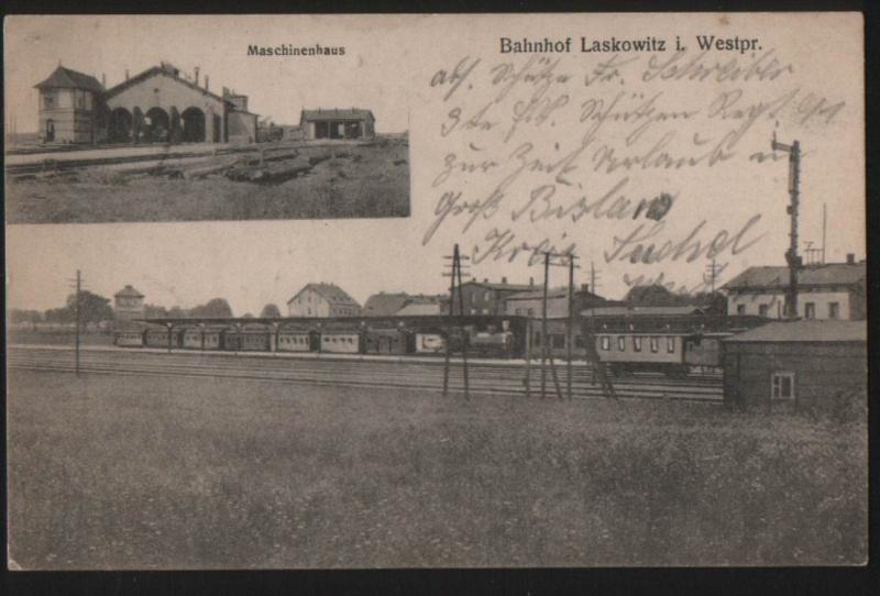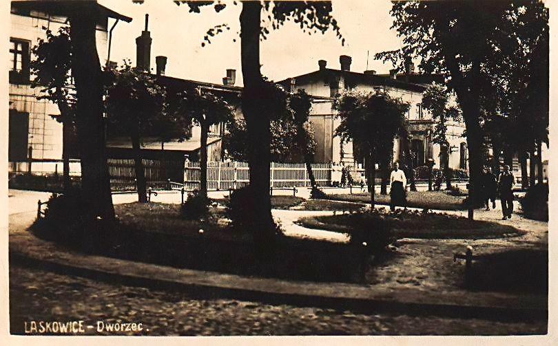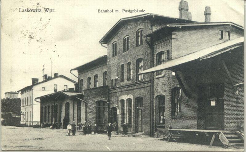 Laskowitz. Bahnhof. Lata 40 XX wieku z serii pocztówek nr 02, wyd. H. Hoffmann, Posen; prawdopodobnie przed zmianą nazwy - przed 1942 rokiem; stempel nieczytelny, brak znaczka; widok "przycięty" ze względu na stan zachowania pocztówki.