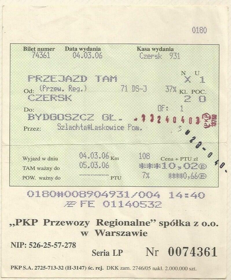 Bilet wydany w kasie biletowej stacji Czersk na trasę Czersk - Bydgoszcz Główna przez Osie.