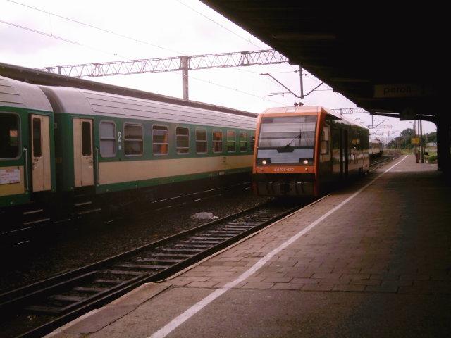Na peronie 1 autobus szynowy do Czerska, w tle pospieszny "Bachus" z Gdyni do Zielonej Góry.