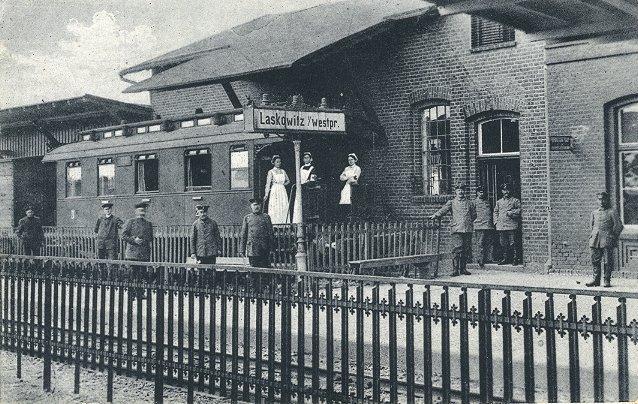 Laskowitz Wpr. Bahnhof m. Budynek dworca został otynkowany ok. 1918 roku; w tle po lewej widać zbiornik jednej z wież ciśnień - nie zachowała się; wydawca nieznany.