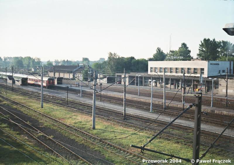 PKP Przeworsk. Budynek dworca i ówczesny peron 1. Widok w kierunku południowo-wschodnim, od strony wjazdów z Rzeszowa i Stalowej Woli.