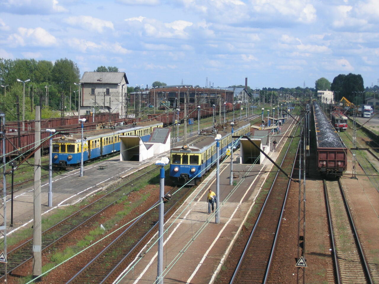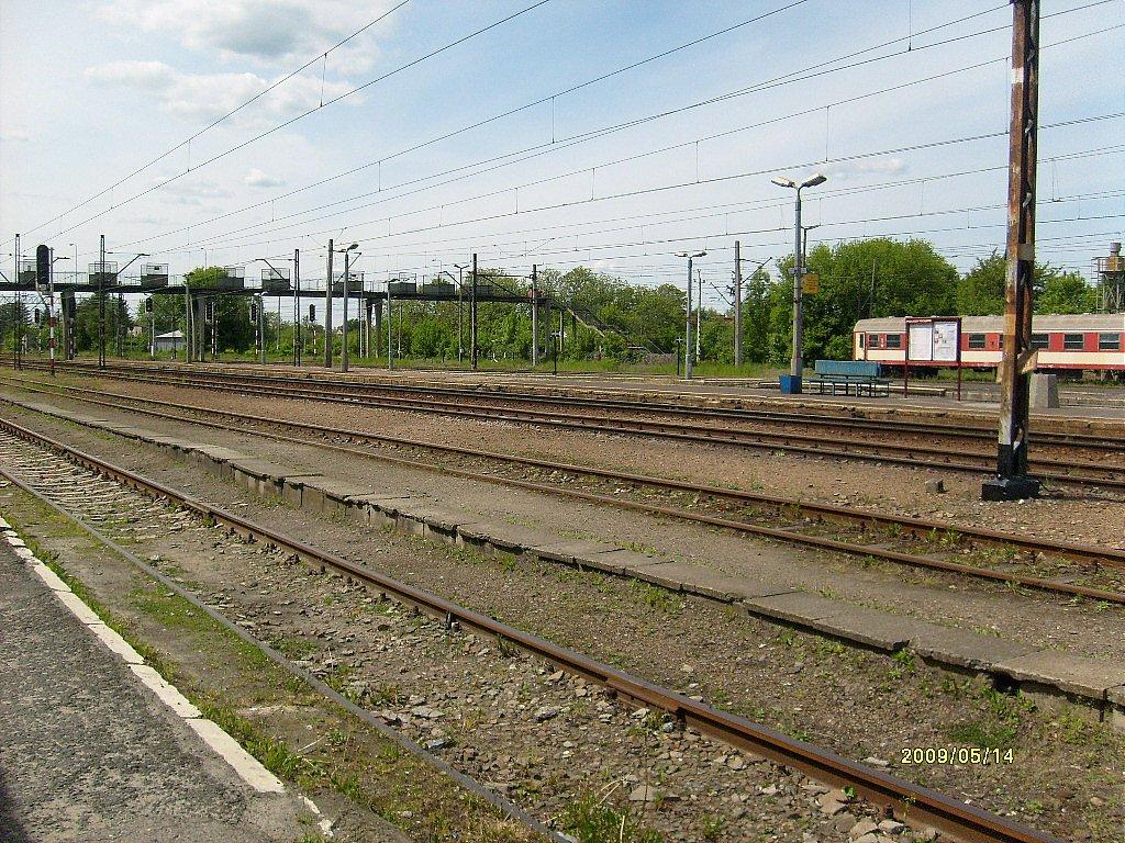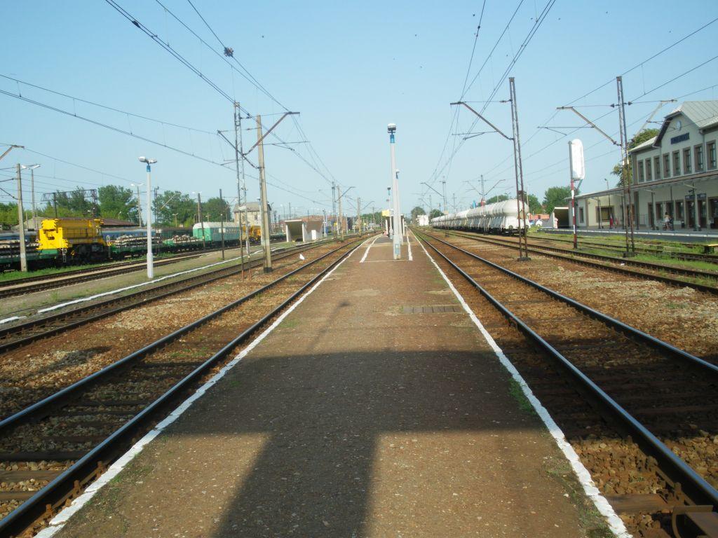 W środku peron 2, z prawej (poza kadrem) peron 1 oraz dworzec, z lewej peron 3. W tle, po lewej wieża wodna i zaplecze trakcyjne. Zdjęcie wykonano z kładki nad torami. Widok w kierunku wschodnim: Jarosław.