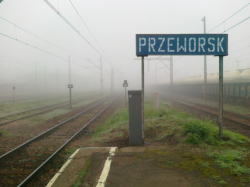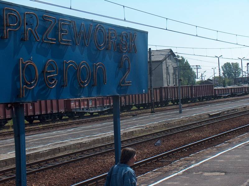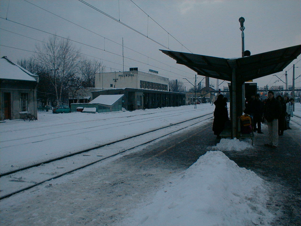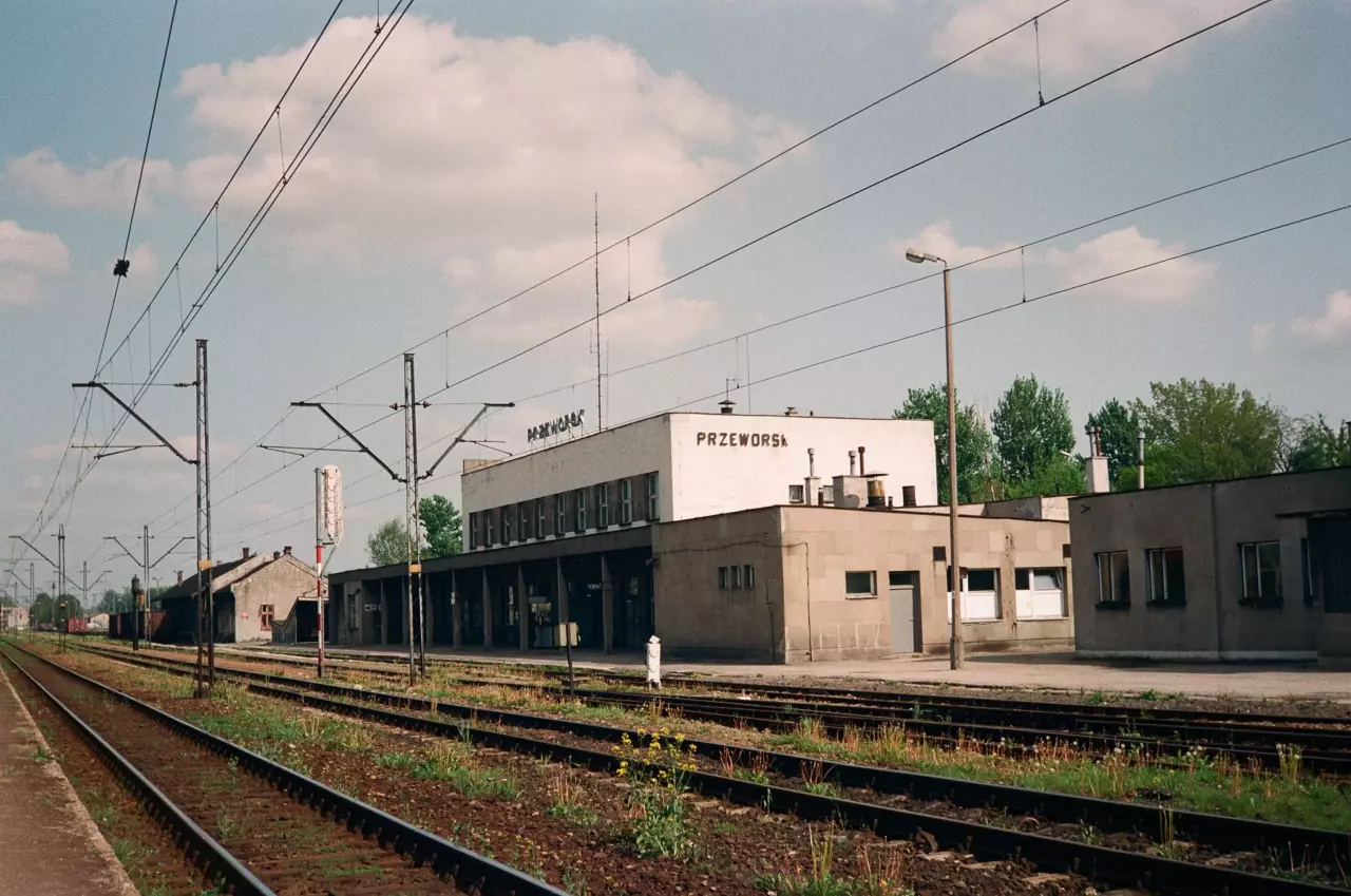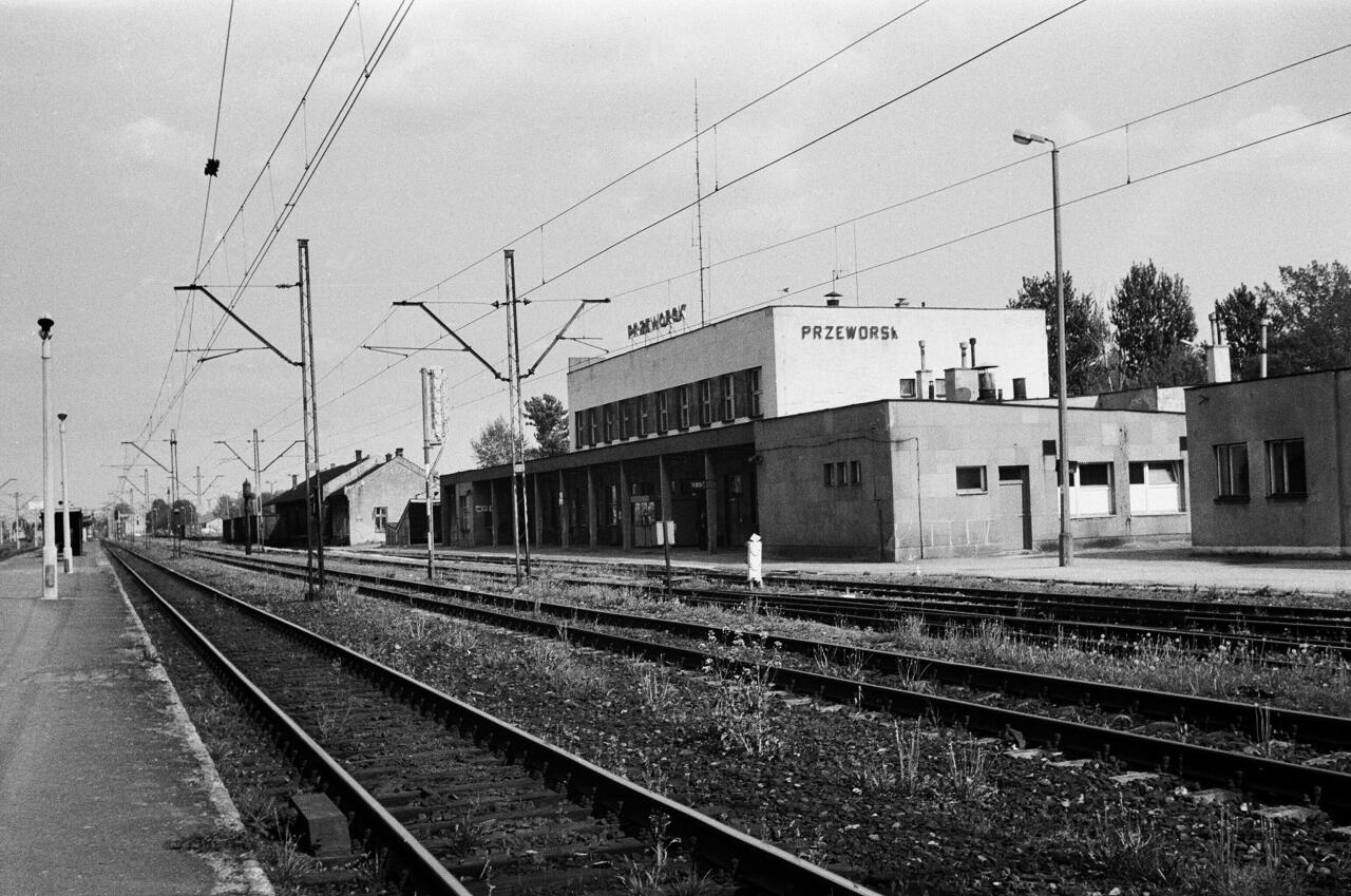 Na peronie stacji w Przeworsku o 14:44. Przedostatni zmierzch lat 19xx. W oczekiwaniu na Solinę do Warszawy, planowy odjazd 15:13. Z lewej fragment magazynu towarowego oraz budynek dworca. Widok w kierunku południowo-zachodnim, od strony wjazdu z Jarosławia.