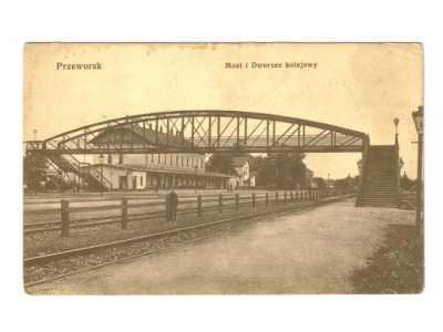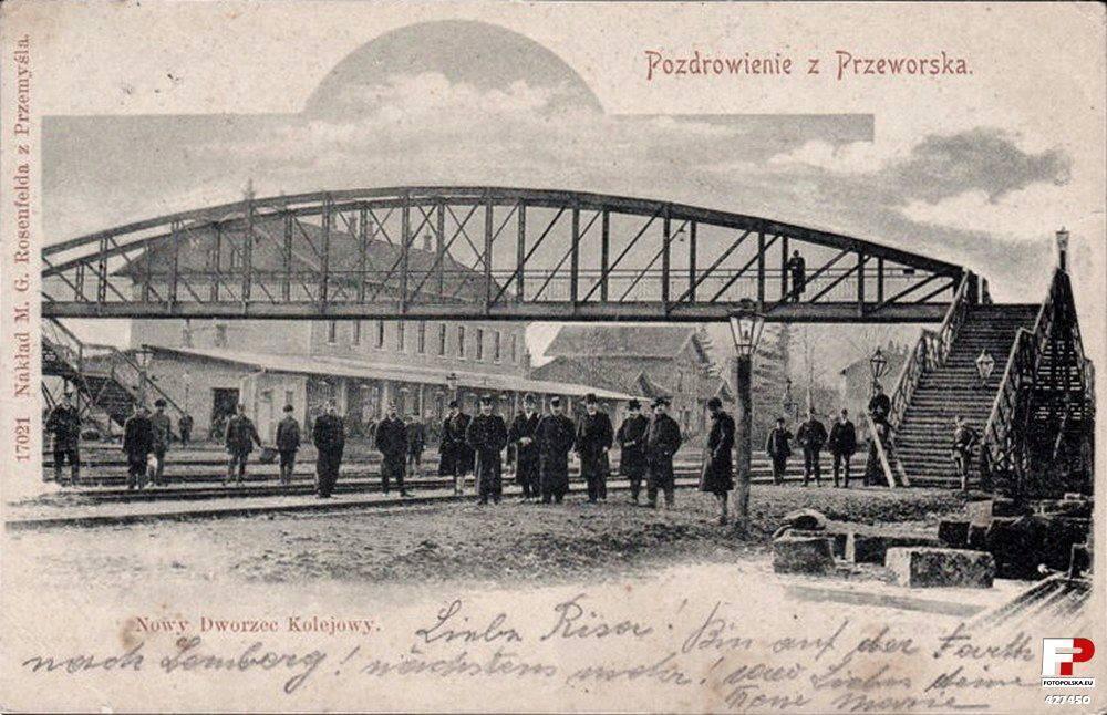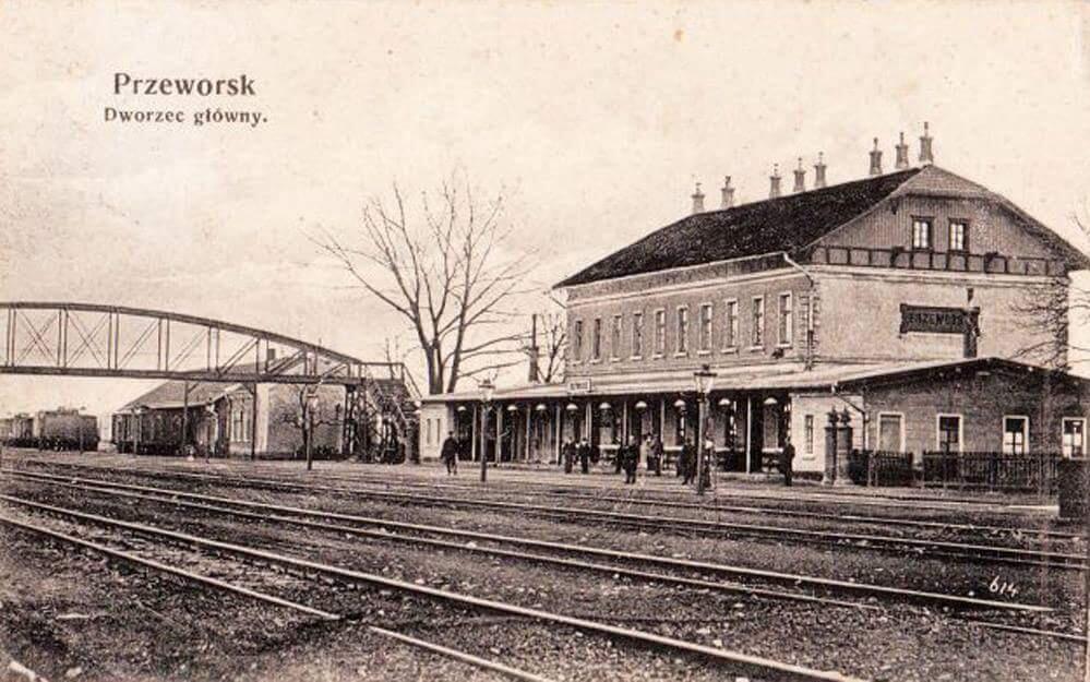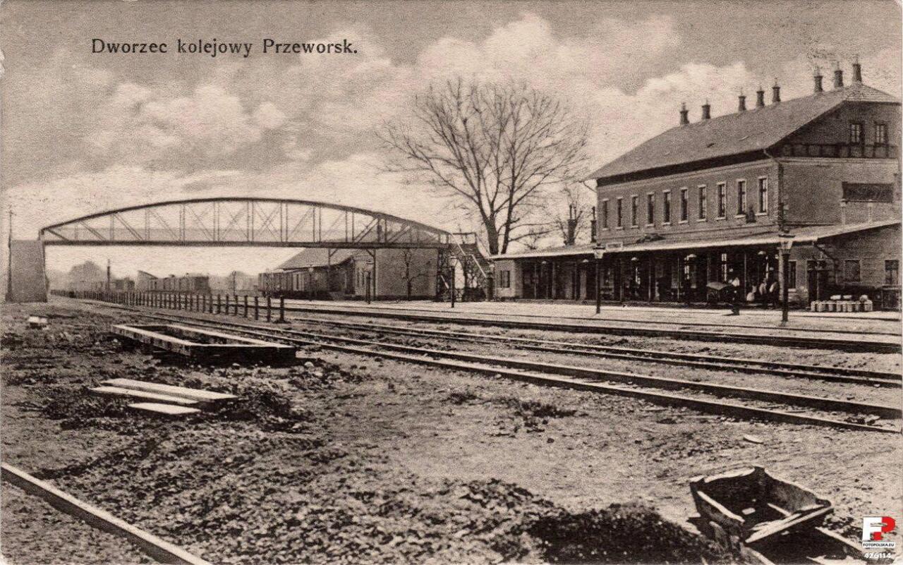 Dawny dworzec kolejowy i kładka nad torami w Przeworsku. Widok od strony peronów w kierunku południowo-wschodnim, od strony wjazdów z Rzeszowa i Stalowej Woli. Zdjęcie ze strony FB Austro-Hungarian Bahnhöfe/Австро-угорські двірці залізничні.
