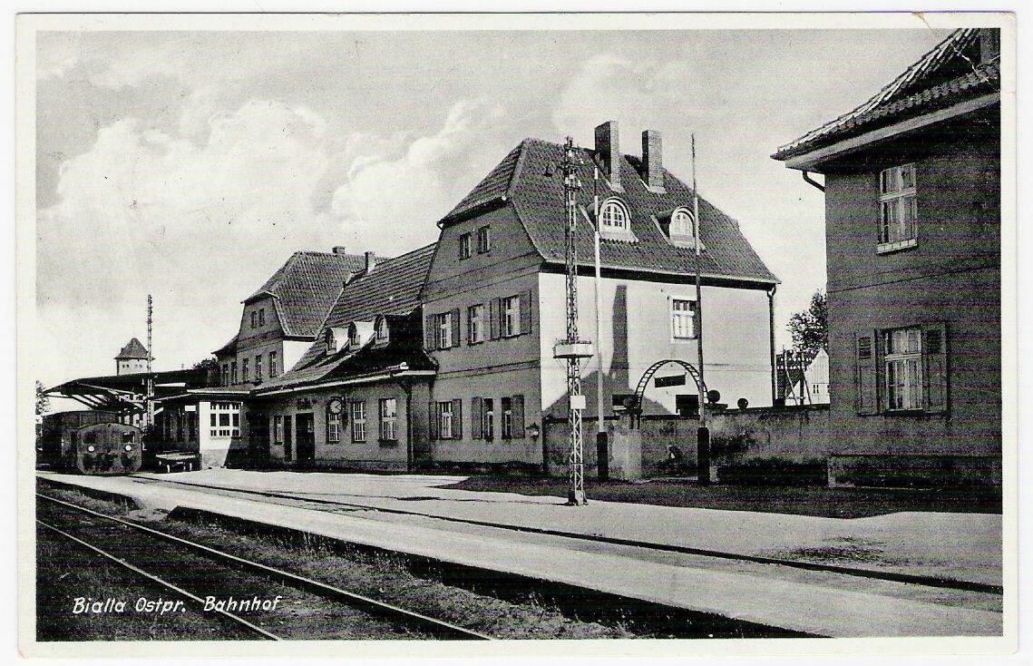 Stacja Biała k. Piszu (Biała Piska), kompleks budynków dworca, widok od strony miasta. Dawniej na brukowanym placu przy dworcu znajdował się dworzec autobusowy PKS. Zdjęcie wykonano na dzień lub dwa przed zamknięciem stacji (zamknięto nastawnie, zlikwidowano kasę biletową, zakończono krzyżowanie pociągów), która stała się wtedy przystankiem kolejowym z nieczynną infrastrukturą stacyjną. Po prawej stronie w oddali widoczna nieistniejąca wieża ciśnień.