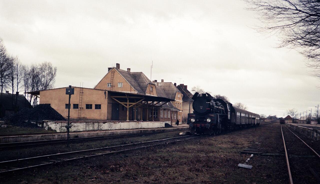 Stacja Biała koło Piszu - magazyn towarowy, budynek stacyjny, z prawej rampa ładownicza boczna, pociąg M 9633 relacji Ruciane Nida - Ełk, prowadzony parowozem Ol48-80 (MD Ełk). Widok w kierunku stacji Szczytno (Olsztyn Główny).