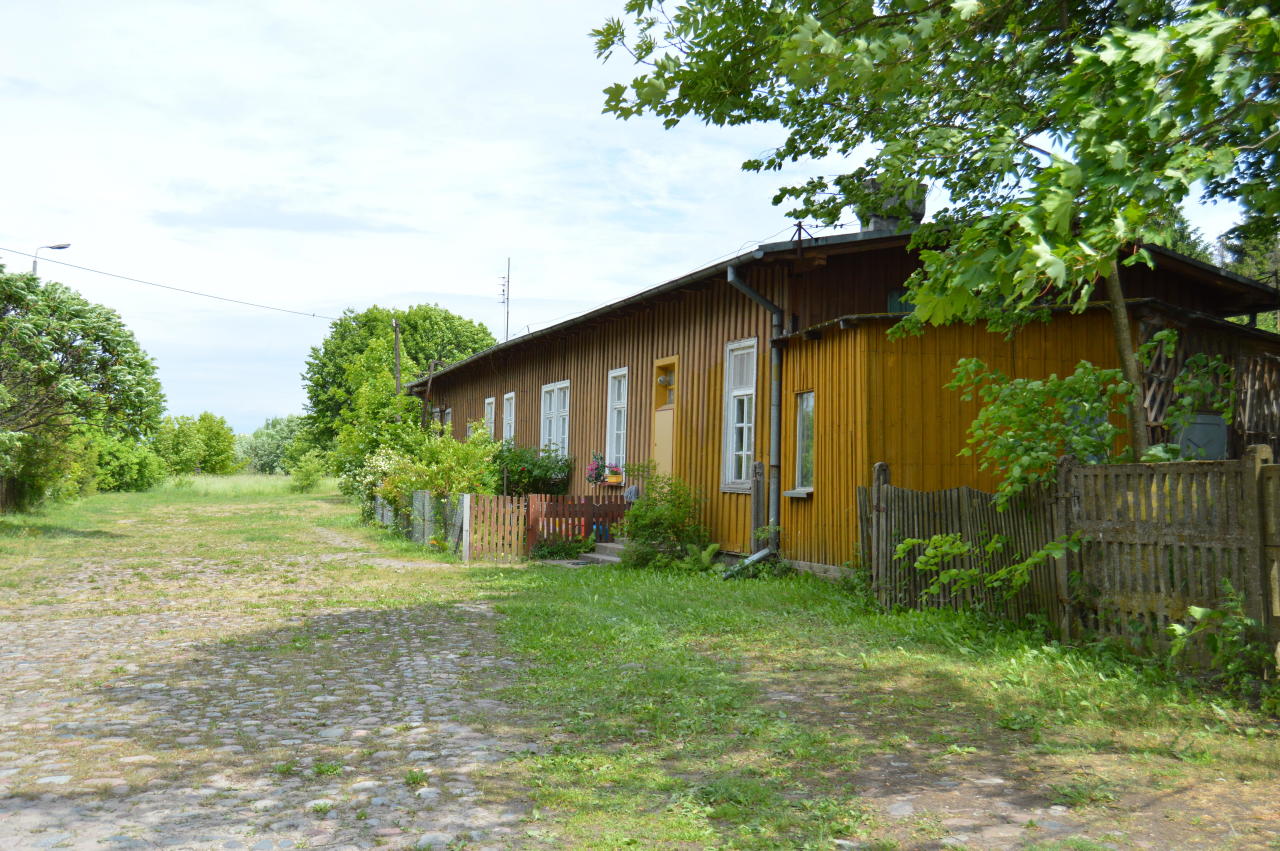 Kolejowy budynek mieszkalny z przyległą częścią z pomieszczeniami WC, widoczny od strony torów. W lewo Pisz/Olsztyn Główny, w prawo Ełk.